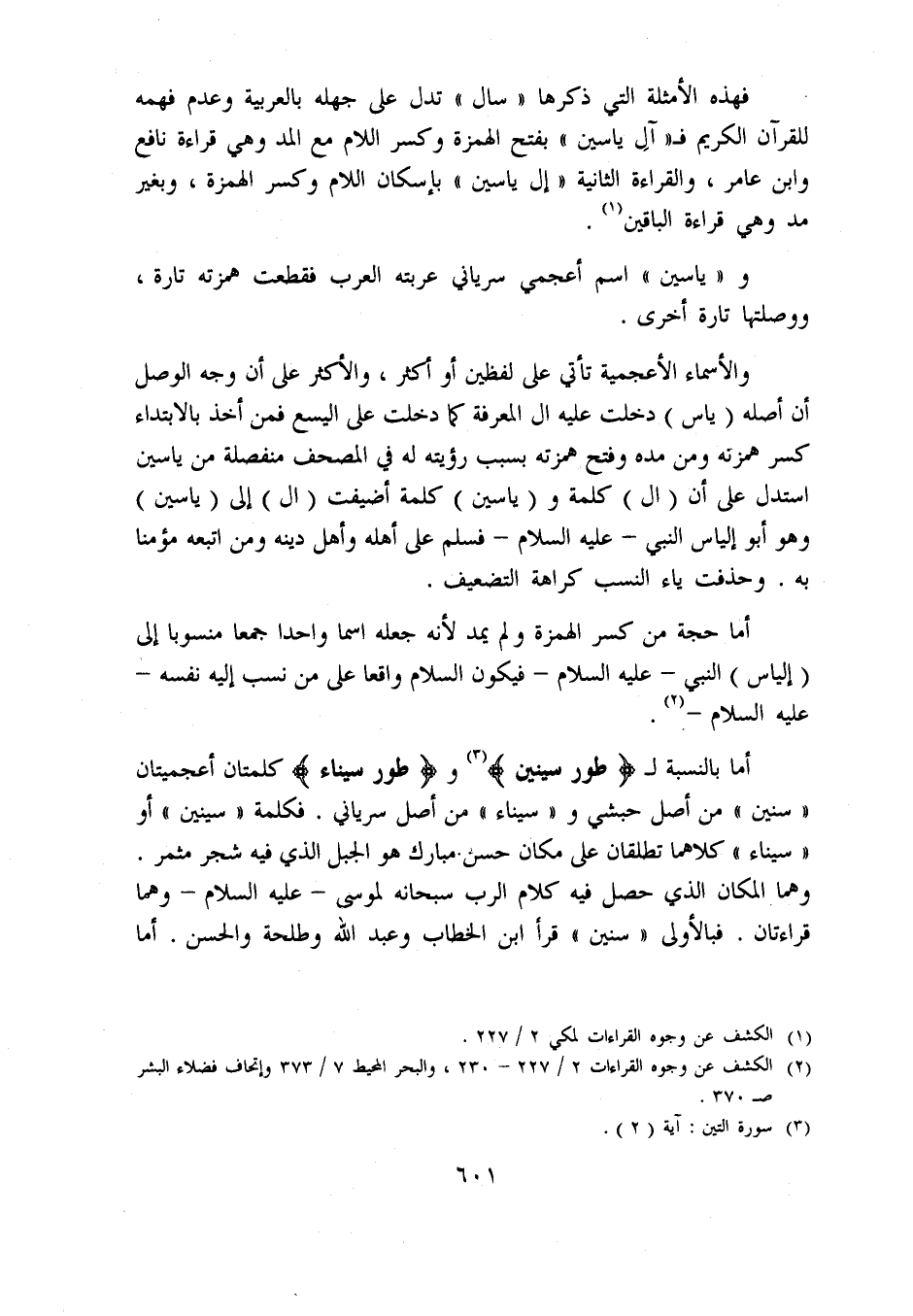 فهذه الأمثلة التي ذكرها «سال» تدل على جهله بالعربية وعدم فهمه للقرآن الكريم ف «آل ياسين» بفتح الهمزة وكسر اللام مع المد وهي قراءة نافع وابن عامر، والقراءة الثانية «إل ياسين» بإسكان اللام وكسر الهمزة، وبغير مد وهي قراءة الباقين «1».