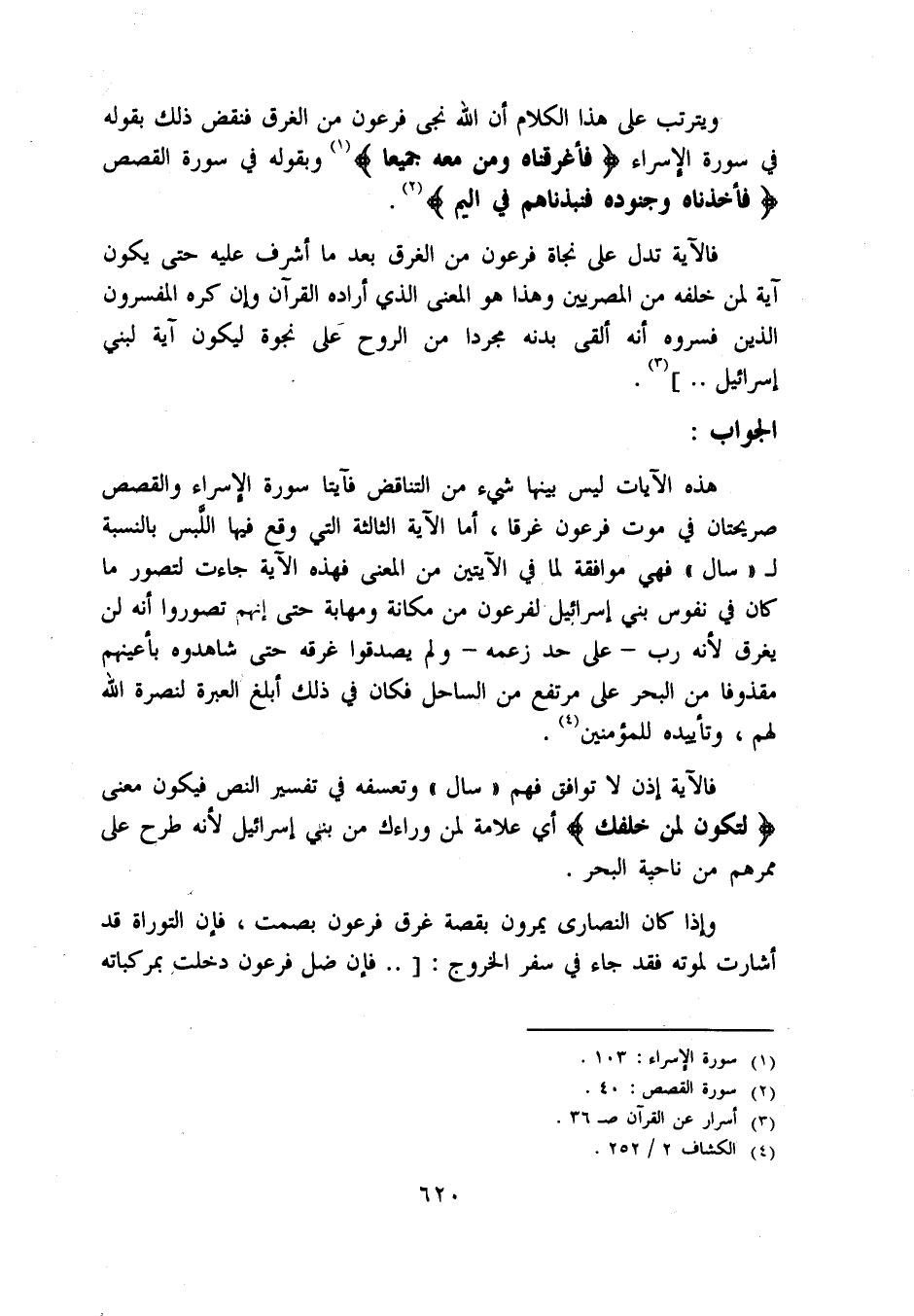 هذه الآيات ليس بينها شيء من التناقض فآيتا سورة الإسراء والقصص صريحتان في موت فرعون غرقا، أما الآية الثالثة التي وقع فيها اللّبس بالنسبة ل «سال» فهي موافقة لما في الآيتين من المعنى فهذه الآية جاءت لتصور ما كان في نفوس بني إسرائيل لفرعون من مكانة ومهابة حتى إنهم تصوروا أنه لن يغرق لأنه رب - على حد زعمه - ولم يصدقوا غرقه حتى شاهدوه بأعينهم مقذوفا من البحر على مرتفع من الساحل فكان في ذلك أبلغ العبرة لنصرة اللّه لهم، وتأييده للمؤمنين «4».