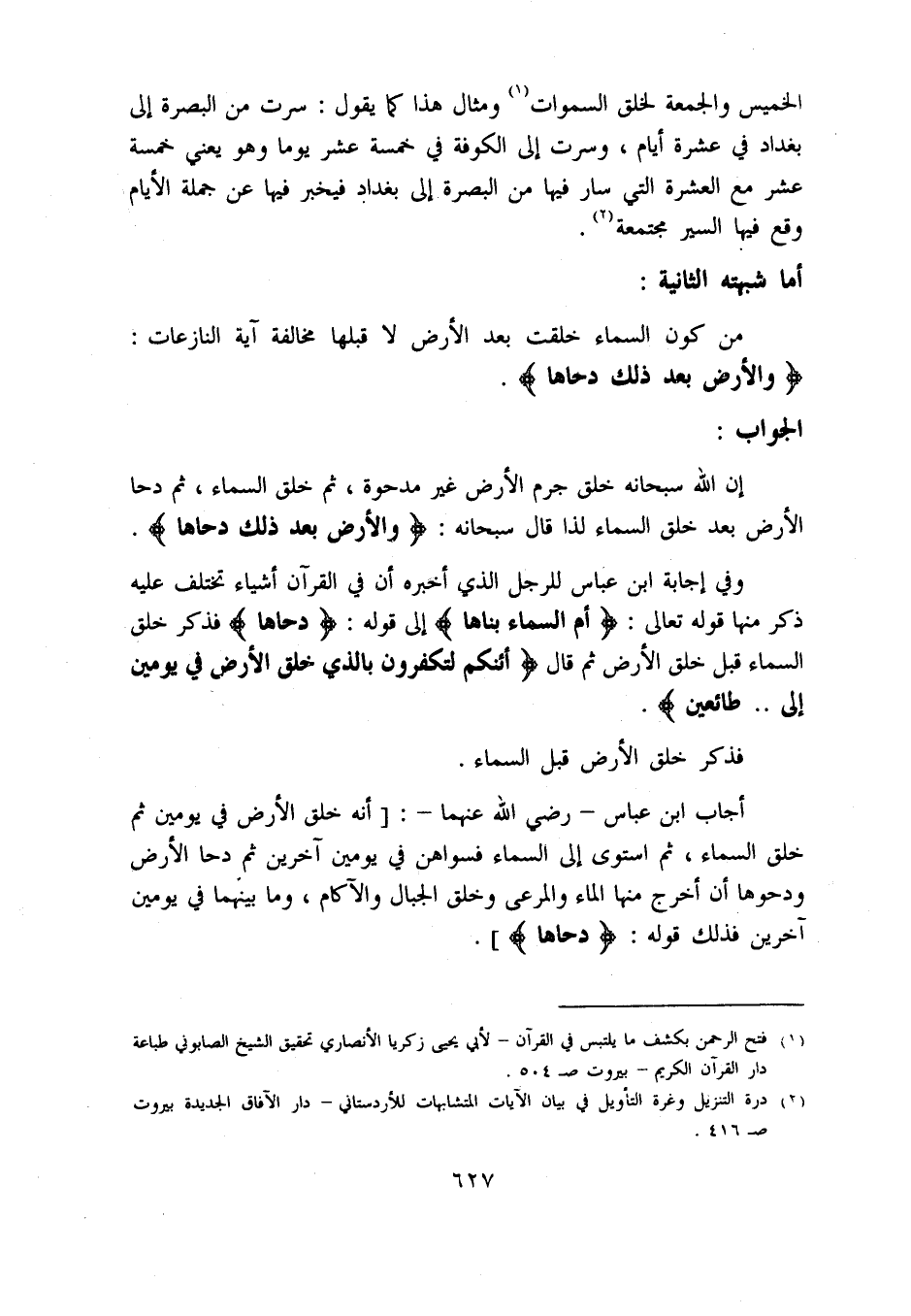 وفي إجابة ابن عباس للرجل الذي أخبره أن في القرآن أشياء تختلف عليه ذكر منها قوله تعالى: أَمِ السَّماءُ بَناها إلى قوله: دَحاها فذكر خلق السماء قبل خلق الأرض ثم قال أَإِنَّكُمْ لَتَكْفُرُونَ بِالَّذِي خَلَقَ الْأَرْضَ فِي يَوْمَيْنِ إلى .. طائِعِينَ.