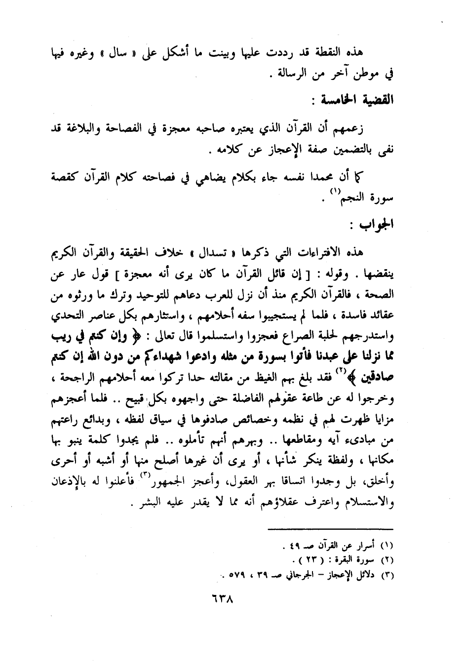 هذه الافتراءات التي ذكرها «تسدال» خلاف الحقيقة والقرآن الكريم ينقضها. وقوله: [إن قائل القرآن ما كان يرى أنه معجزة] قول عار عن الصحة، فالقرآن الكريم منذ أن نزل للعرب دعاهم للتوحيد وترك ما ورثوه من عقائد فاسدة، فلما لم يستجيبوا سفه أحلامهم، واستثارهم بكل عناصر التحدي واستدرجهم لحلبة الصراع فعجزوا واستسلموا قال تعالى: وإِنْ كُنْتُمْ فِي رَيْبٍ مِمَّا نَزَّلْنا عَلى عَبْدِنا فَاتُوا بِسُورَةٍ مِنْ مِثْلِهِ وادْعُوا شُهَداءَكُمْ مِنْ دُونِ اللَّهِ إِنْ كُنْتُمْ صادِقِينَ «2» فقد بلغ بهم الغيظ من مقالته حدا تركوا معه أحلامهم الراجحة، وخرجوا له عن طاعة عقولهم الفاضلة حتى واجهوه بكل قبيح .. فلما أعجزهم مزايا ظهرت لهم في نظمه وخصائص صادفوها في سياق لفظه، وبدائع راعتهم من مبادئ آية ومقاطعها .. وبهرهم أنهم تأملوه .. فلم يجدوا كلمة ينبو بها مكانها، ولفظة ينكر شأنها، أو يرى أن غيرها أصلح منها أو أشبه أو أحرى وأخلق، بل وجدوا اتساقا بهر العقول، وأعجز الجمهور «3» فأعلنوا له بالإذعان والاستسلام واعترف عقلاؤهم أنه مما لا يقدر عليه البشر.