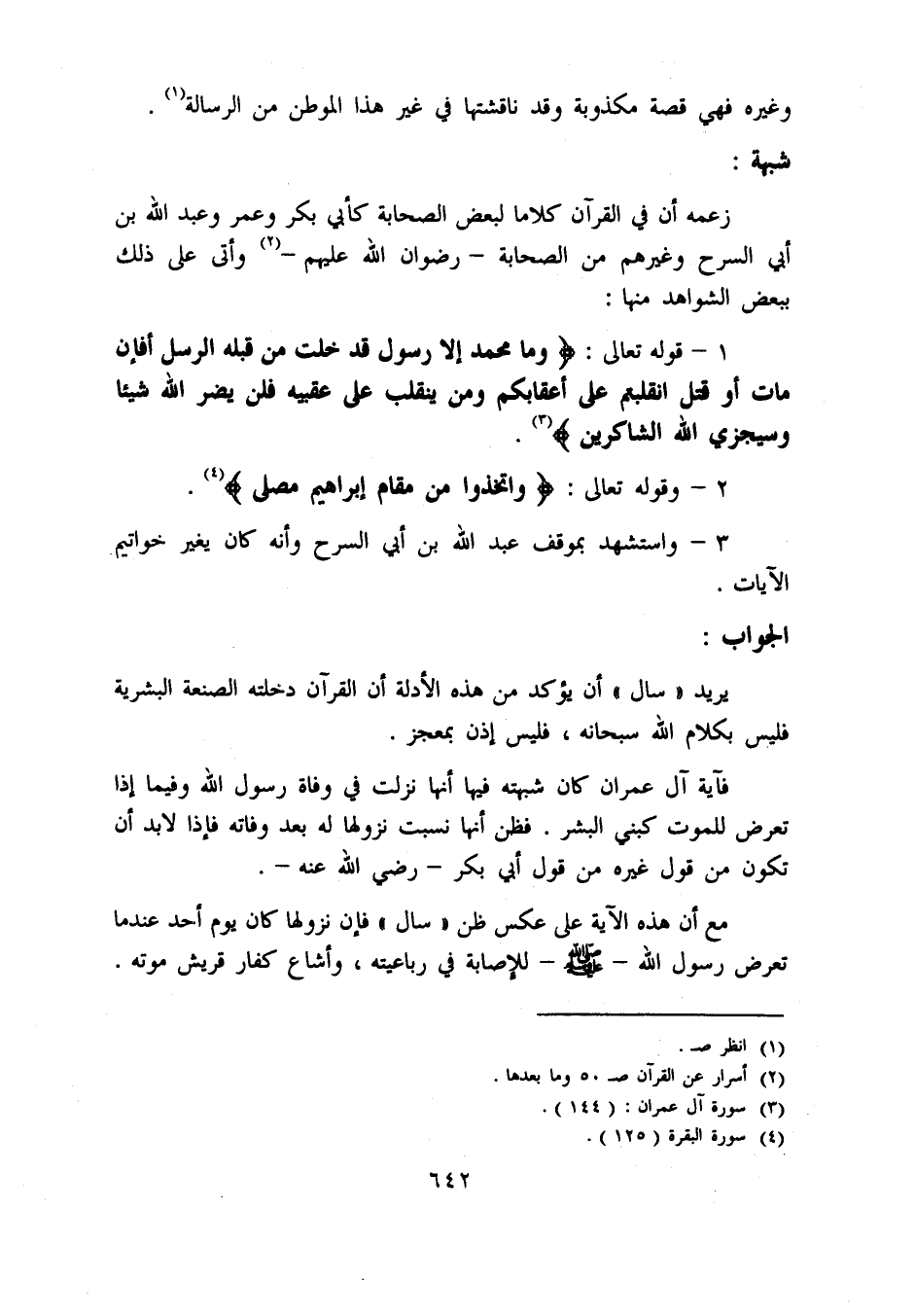 فآية آل عمران كان شبهته فيها أنها نزلت في وفاة رسول اللّه وفيما إذا تعرض للموت كبني البشر. فظن أنها نسبت نزولها له بعد وفاته فإذا لا بد أن تكون من قول غيره من قول أبي بكر - رضي اللّه عنه -.