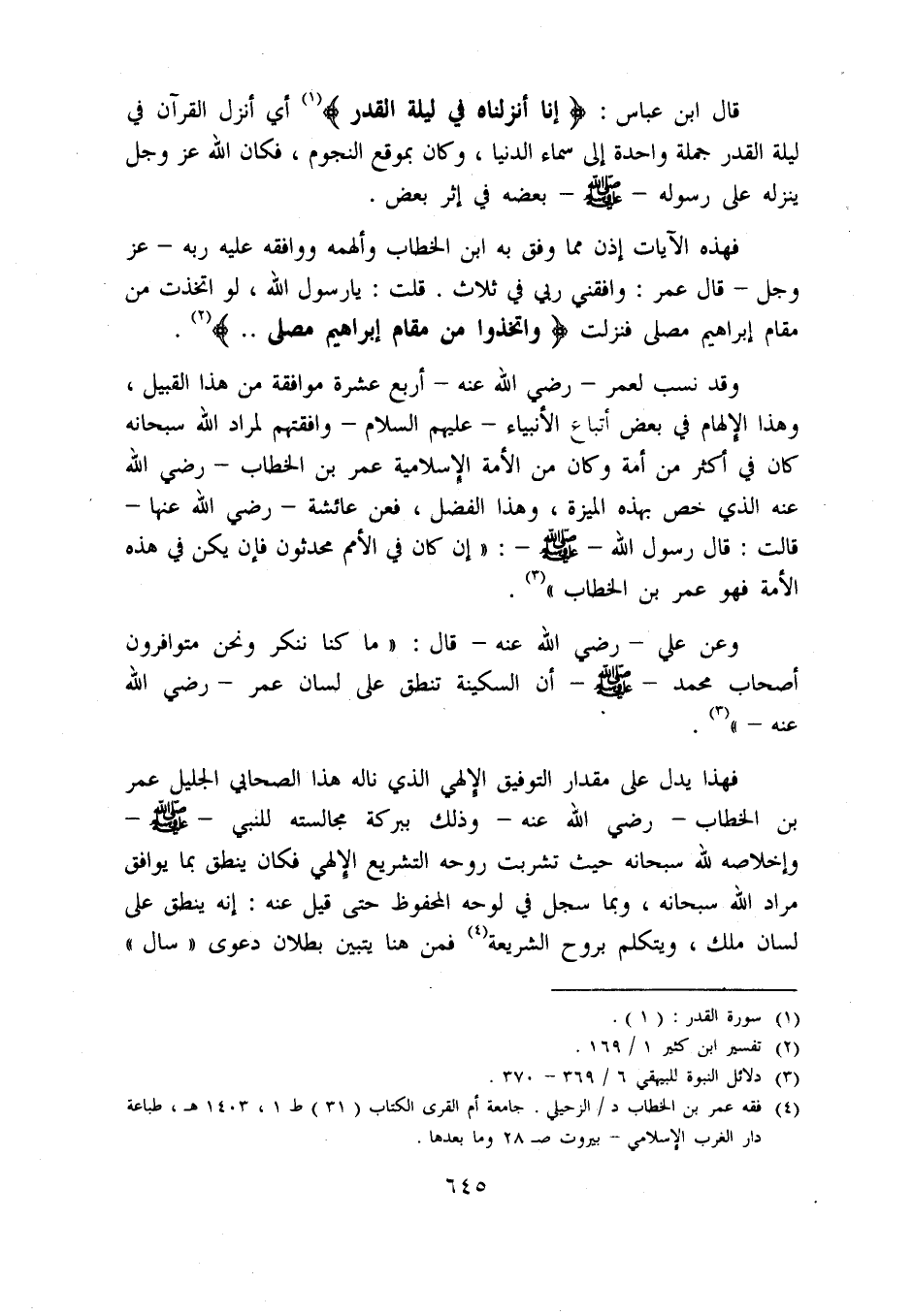 فهذا يدل على مقدار التوفيق الإلهي الذي ناله هذا الصحابي الجليل عمر بن الخطاب - رضي اللّه عنه - وذلك ببركة مجالسته للنبي - صلّى اللّه عليه وسلم - وإخلاصه للّه سبحانه حيث تشربت روحه التشريع الإلهي فكان ينطق بما يوافق مراد اللّه سبحانه، وبما سجل في لوحه المحفوظ حتى قيل عنه: إنه ينطق على لسان ملك، ويتكلم بروح الشريعة «5» فمن هنا يتبين بطلان دعوى «سال»