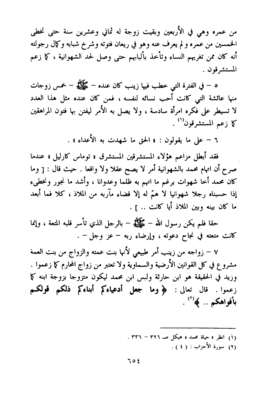 5 - في الفترة التي خطب فيها زينب كان عنده - صلّى اللّه عليه وسلم - خمس زوجات منها عائشة التي كانت أحب نسائه لنفسه، فمن كان عنده مثل هذا العدد لا تسيطر على فكره امرأة سادسة، ولا يصل به الأمر ليفتن بها فتون المراهقين كما زعم المستشرقون «1».