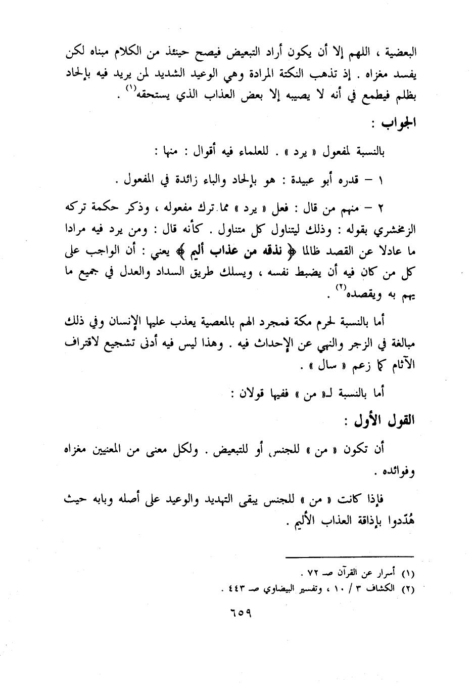 2 - منهم من قال: فعل «يرد» مما ترك مفعوله، وذكر حكمة تركه الزمخشري بقوله: وذلك ليتناول كل متناول. كأنه قال: ومن يرد فيه مرادا ما عادلا عن القصد ظالما نُذِقْهُ مِنْ عَذابٍ أَلِيمٍ يعني: أن الواجب على كل من كان فيه أن يضبط نفسه، ويسلك طريق السداد والعدل في جميع ما يهم به ويقصده «2».
