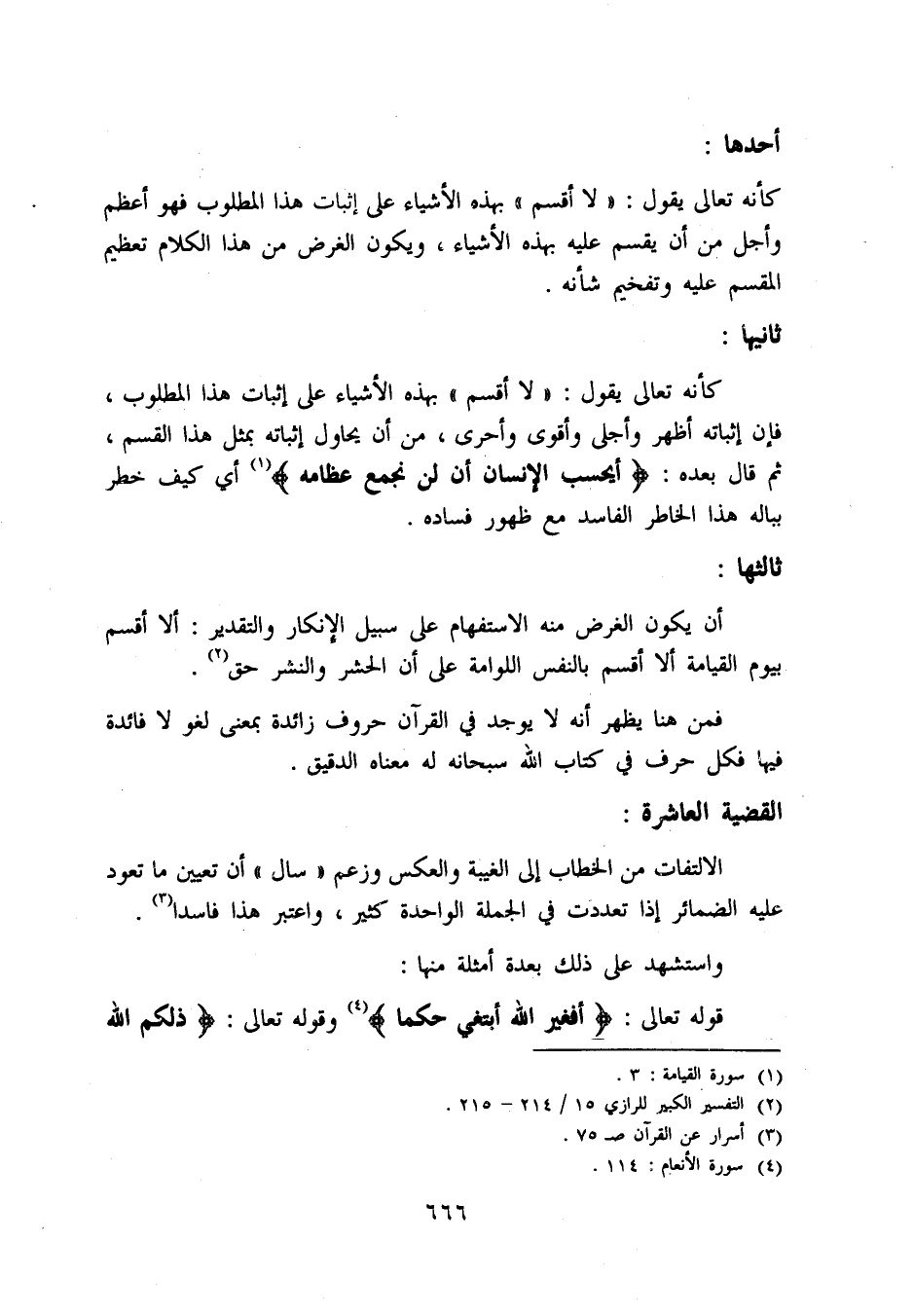 كأنه تعالى يقول: «لا أقسم» بهذه الأشياء على إثبات هذا المطلوب، فإن إثباته أظهر وأجلى وأقوى وأحرى، من أن يحاول إثباته بمثل هذا القسم، ثم قال بعده: أَيَحْسَبُ الْإِنْسانُ أَلَّنْ نَجْمَعَ عِظامَهُ «1» أي كيف خطر بباله هذا الخاطر الفاسد مع ظهور فساده.