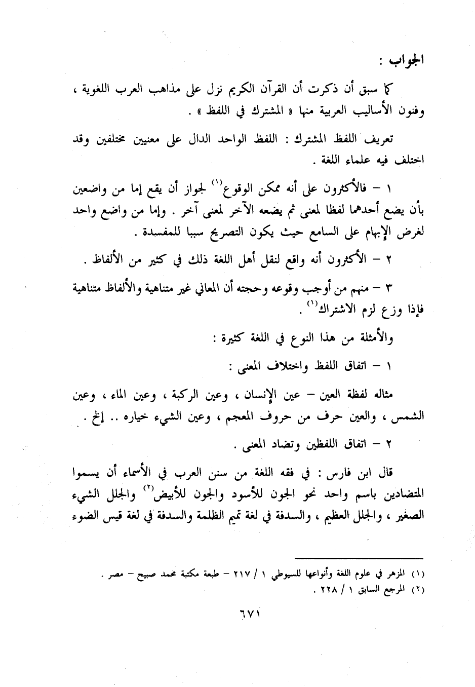 كما سبق أن ذكرت أن القرآن الكريم نزل على مذاهب العرب اللغوية، وفنون الأساليب العربية منها «المشترك في اللفظ».