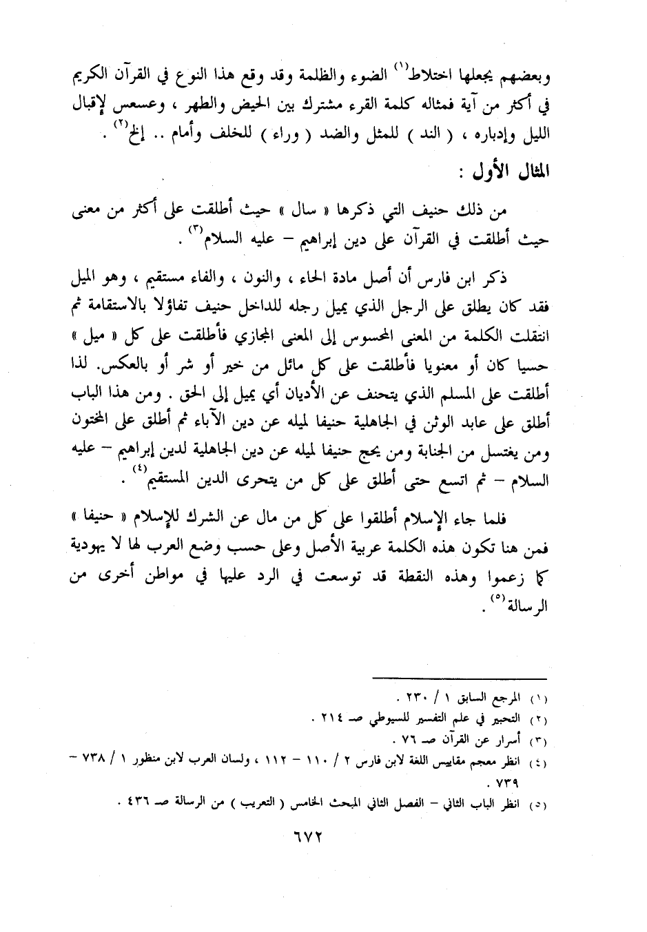 من ذلك حنيف التي ذكرها «سال» حيث أطلقت على أكثر من معنى حيث أطلقت في القرآن على دين إبراهيم - عليه السلام «3».