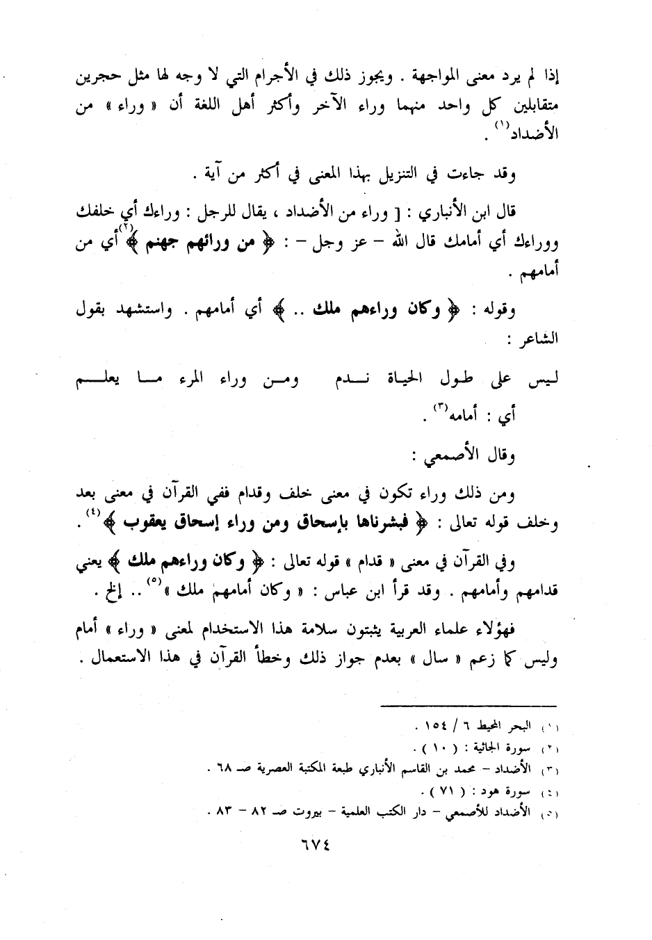 وفي القرآن في معنى «قدام» قوله تعالى: وكانَ وَراءَهُمْ مَلِكٌ يعني قدامهم وأمامهم. وقد قرأ ابن عباس: «وكان أمامهم ملك» «5» .. إلخ.