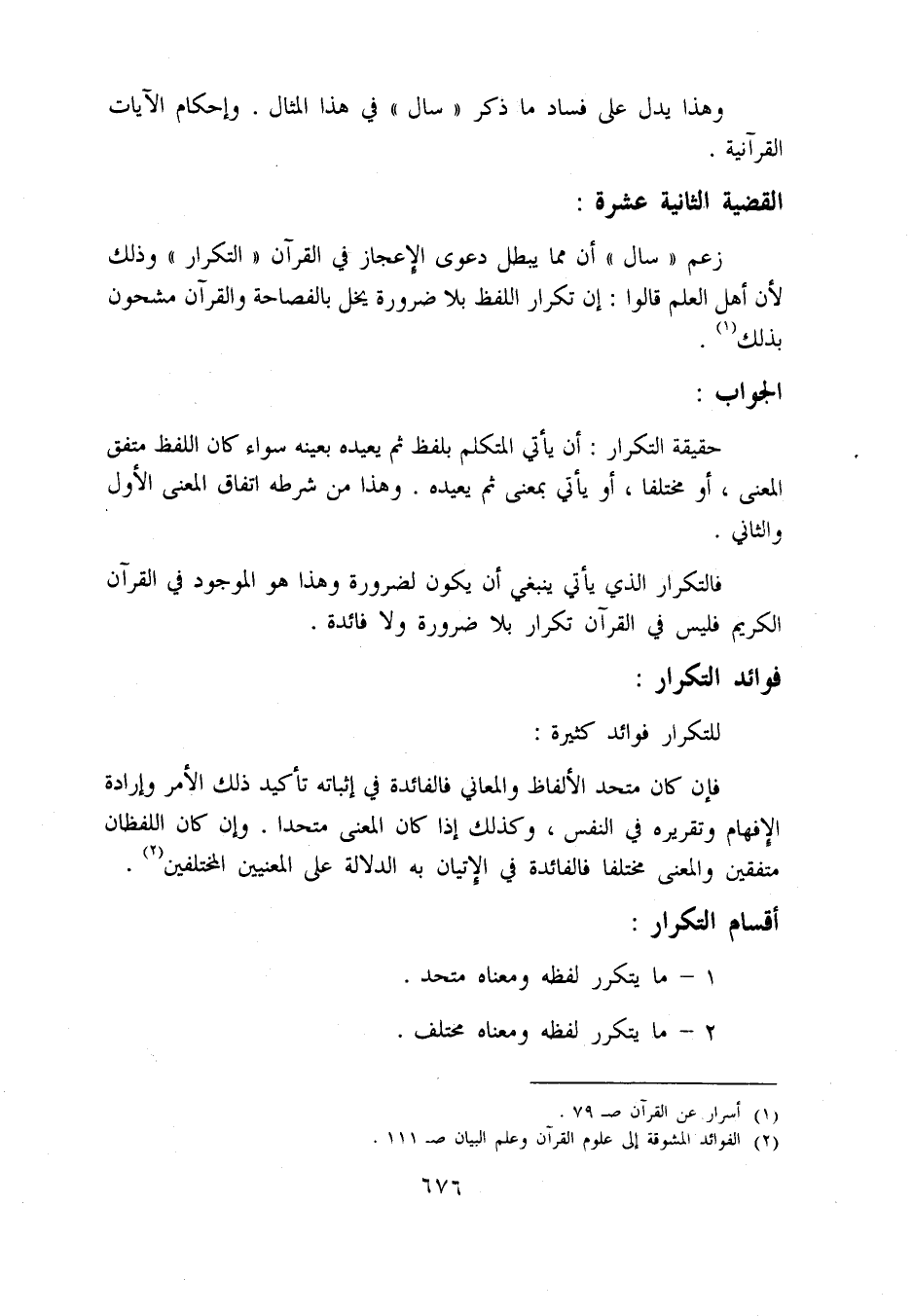 زعم «سال» أن مما يبطل دعوى الإعجاز في القرآن «التكرار» وذلك لأن أهل العلم قالوا: إن تكرار اللفظ بلا ضرورة يخل بالفصاحة والقرآن مشحون بذلك «1».