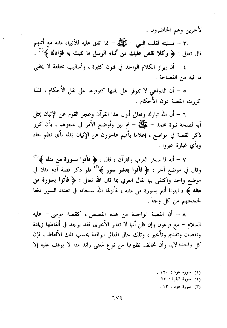 8 - أن القصة الواحدة من هذه القصص، كقصة موسى - عليه السلام - مع فرعون وإن ظن أنها لا تغاير الأخرى فقد يوجد في ألفاظها زيادة ونقصان وتقديم وتأخير، وتلك حال المعاني الواقعة بحسب تلك الألفاظ، فإن كل واحدة لا بد وأن تخالف نظيرتها من نوع معنى زائد منه لا يوقف عليه إلا