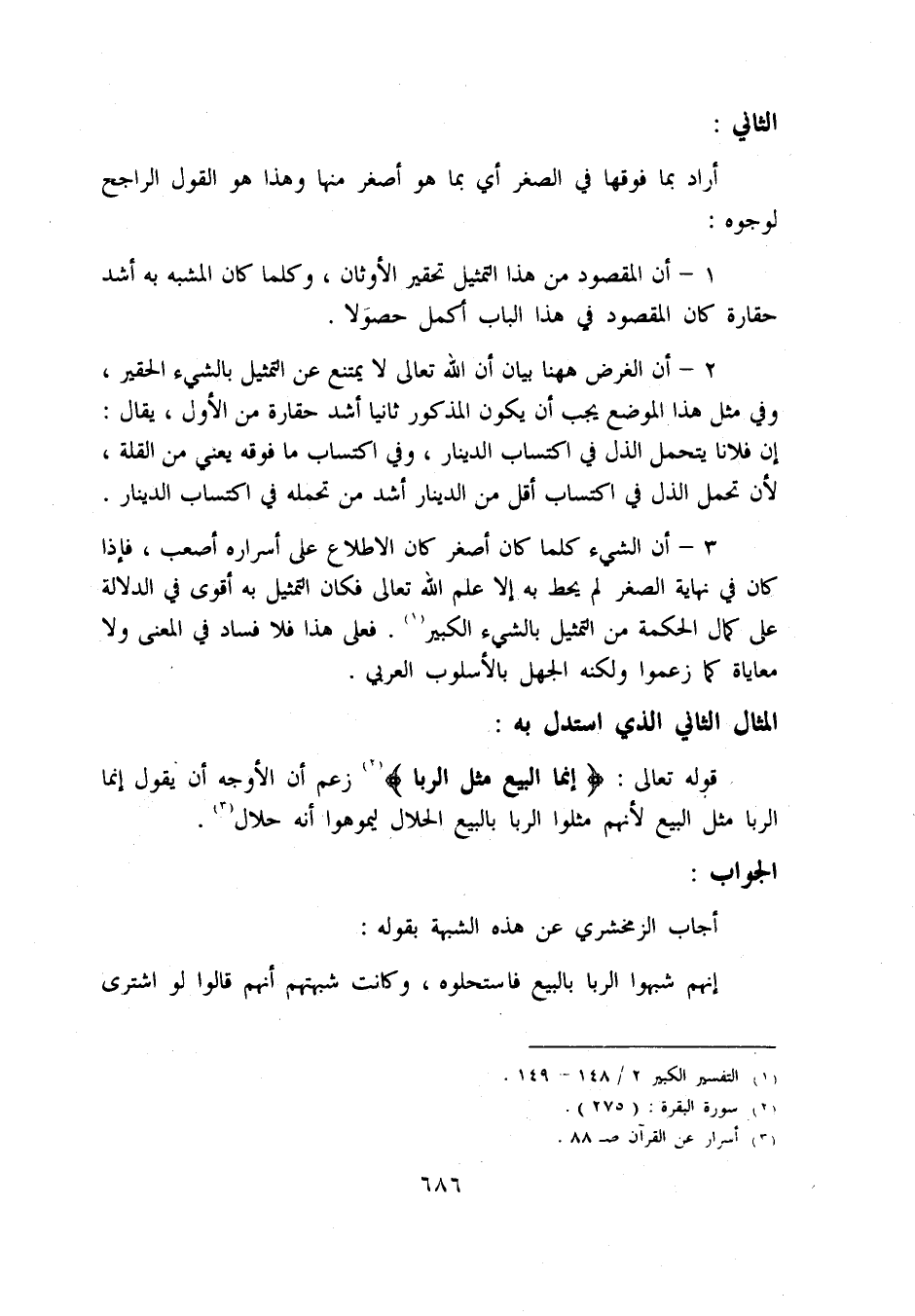 قوله تعالى: إِنَّمَا الْبَيْعُ مِثْلُ الرِّبا «2» زعم أن الأوجه أن يقول إنما الربا مثل البيع لأنهم مثلوا الربا بالبيع الحلال ليموهوا أنه حلال «3».