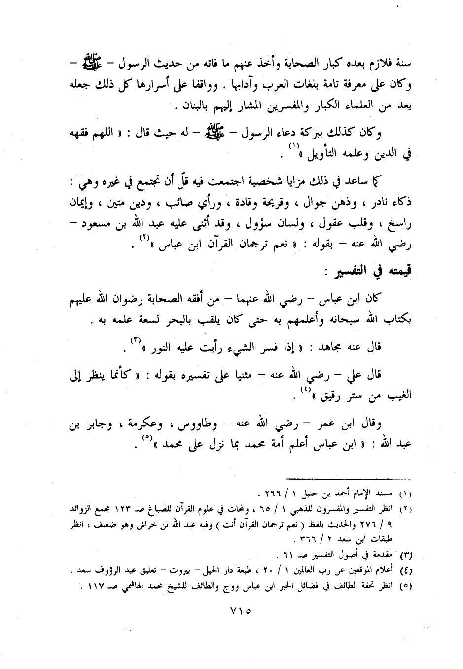 (2) انظر التفسير والمفسرون للذهبي 1/ 65، ولمحات في علوم القرآن للصباغ ص 123 مجمع الزوائد 9/ 276 والحديث بلفظ (نعم ترجمان القرآن أنت) وفيه عبد اللّه بن خراش وهو ضعيف، انظر طبقات ابن سعد 2/ 366.