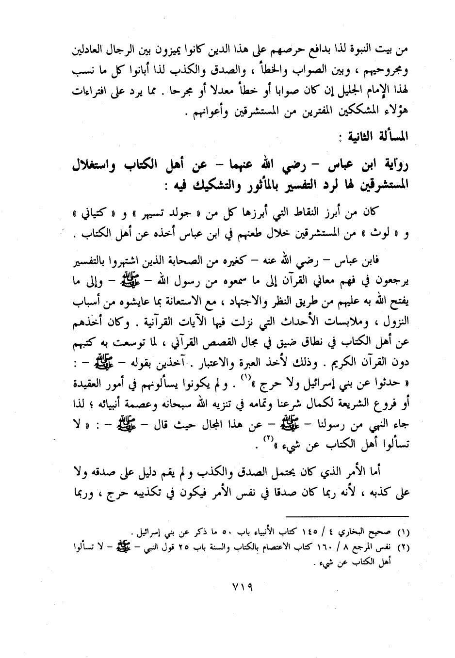 (2) نفس المرجع 8/ 160 كتاب الاعتصام بالكتاب والسنة باب 25 قول النبي - صلّى اللّه عليه وسلم - لا تسألوا أهل الكتاب عن شي ء.