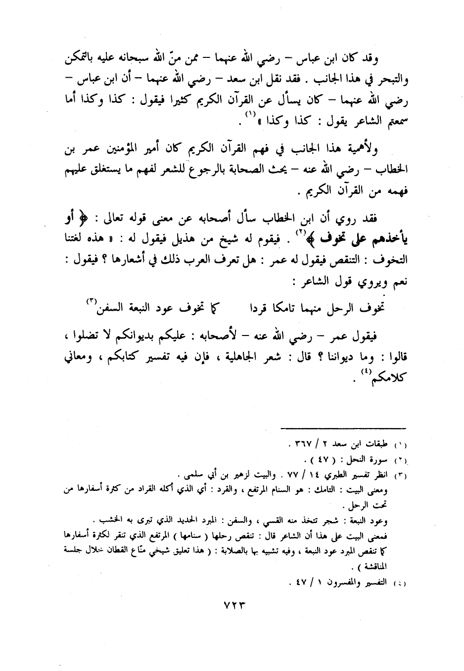 فقد روي أن ابن الخطاب سأل أصحابه عن معنى قوله تعالى: أَوْ يَاخُذَهُمْ عَلى تَخَوُّفٍ «2». فيقوم له شيخ من هذيل فيقول له: «هذه لغتنا التخوف: التنقص فيقول له عمر: هل تعرف العرب ذلك في أشعارها؟ فيقول: