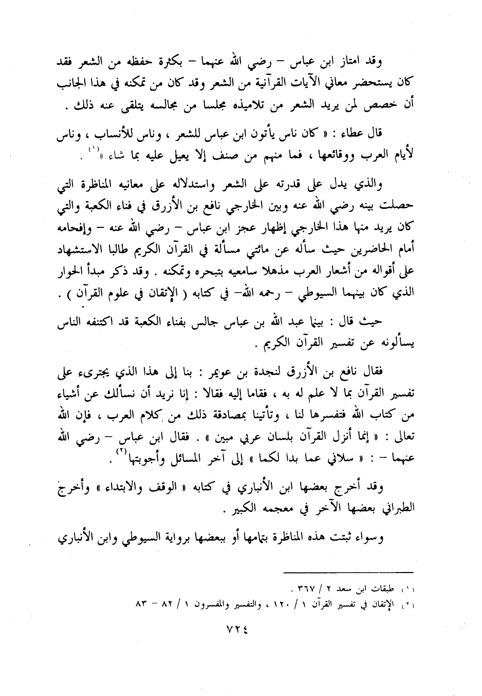 فقال نافع بن الأزرق لنجدة بن عويمر: بنا إلى هذا الذي يجترئ على تفسير القرآن بما لا علم له به، فقاما إليه فقالا: إنا نريد أن نسألك عن أشياء من كتاب اللّه فتفسرها لنا، وتأتينا بمصادقة ذلك من كلام العرب، فإن اللّه تعالى: «إنما أنزل القرآن بلسان عربي مبين». فقال ابن عباس - رضي اللّه عنهما -: «سلاني عما بدا لكما» إلى آخر المسائل وأجوبتها «2».