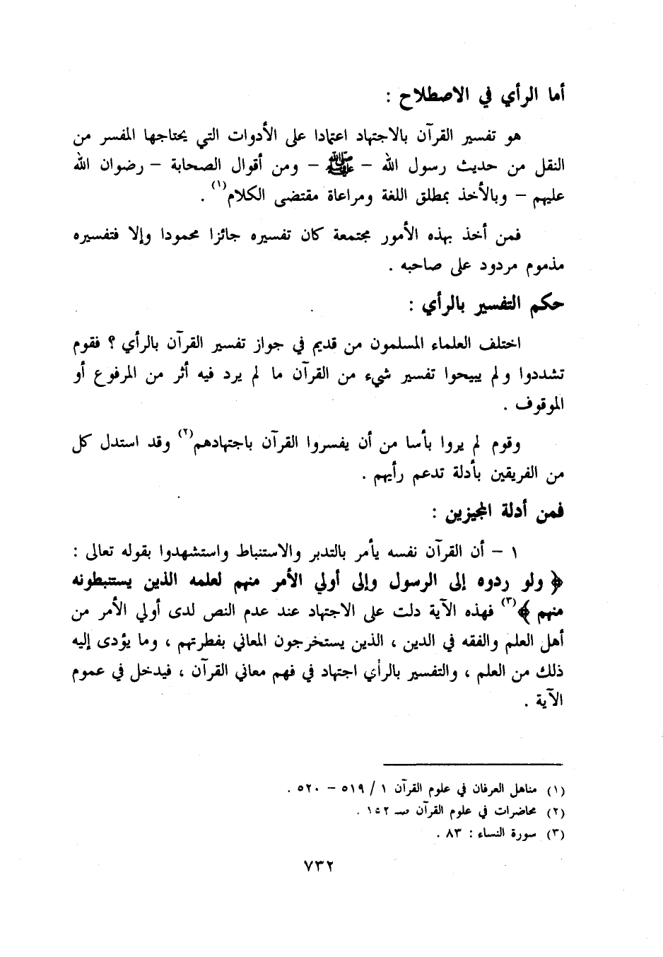 وَ لَوْ رَدُّوهُ إِلَى الرَّسُولِ وإِلى أُولِي الْأَمْرِ مِنْهُمْ لَعَلِمَهُ الَّذِينَ يَسْتَنْبِطُونَهُ مِنْهُمْ «3» فهذه الآية دلت على الاجتهاد عند عدم النص لدى أولي الأمر من أهل العلم والفقه في الدين، الذين يستخرجون المعاني بفطرتهم، وما يؤدى إليه ذلك من العلم، والتفسير بالرأي اجتهاد في فهم معاني القرآن، فيدخل في عموم الآية.