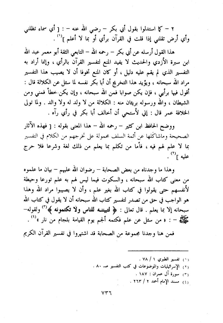 2 - كما استدلوا بقول أبي بكر - رضي اللّه عنه -: [أي سماء تظلني وأي أرض تقلني إذا قلت في القرآن برأي أو بما لا أعلم] «1».