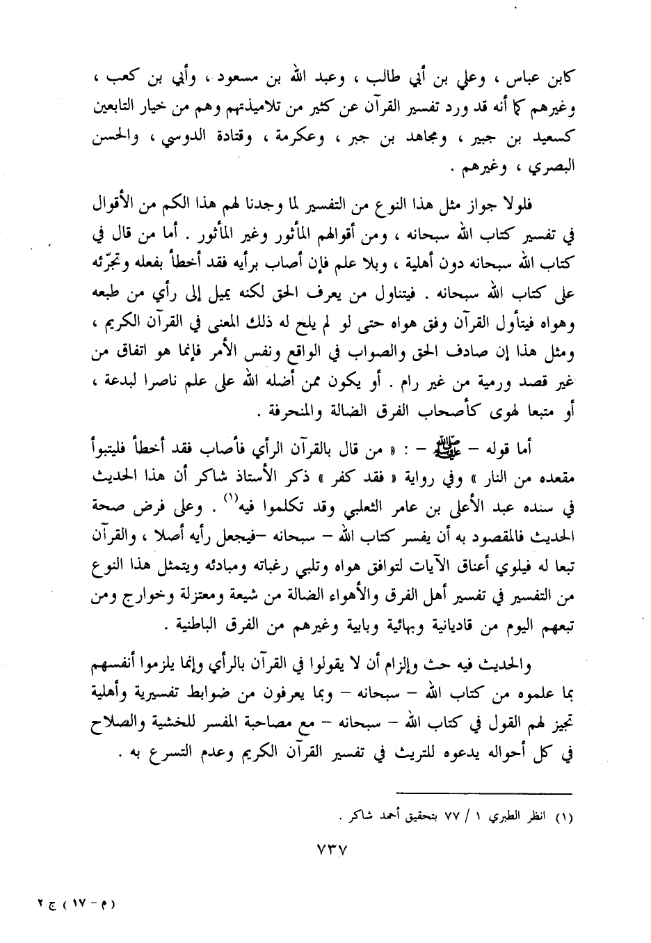 أما قوله - صلّى اللّه عليه وسلم -: «من قال بالقرآن الرأي فأصاب فقد أخطأ فليتبوأ مقعده من النار» وفي رواية «فقد كفر» ذكر الأستاذ شاكر أن هذا الحديث في سنده عبد الأعلى بن عامر الثعلبي وقد تكلموا فيه «1». وعلى فرض صحة الحديث فالمقصود به أن يفسر كتاب اللّه - سبحانه - فيجعل رأيه أصلا، والقرآن تبعا له فيلوي أعناق الآيات لتوافق هواه وتلبي رغباته ومبادئه ويتمثل هذا النوع من التفسير في تفسير أهل الفرق والأهواء الضالة من شيعة ومعتزلة وخوارج ومن تبعهم اليوم من قاديانية وبهائية وبابية وغيرهم من الفرق الباطنية.