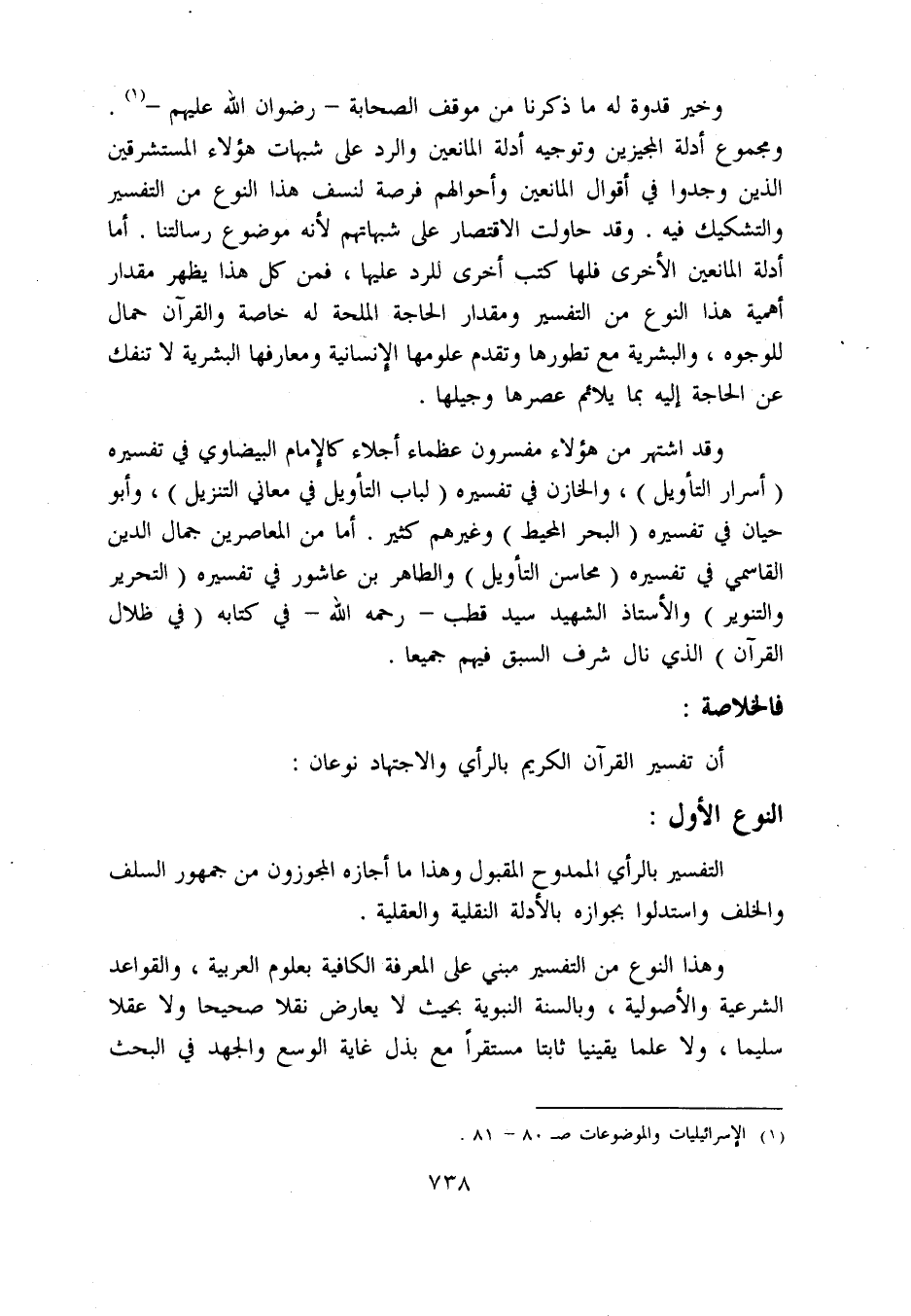 ومجموع أدلة المجيزين وتوجيه أدلة المانعين والرد على شبهات هؤلاء المستشرقين الذين وجدوا في أقوال المانعين وأحوالهم فرصة لنسف هذا النوع من التفسير والتشكيك فيه. وقد حاولت الاقتصار على شبهاتهم لأنه موضوع رسالتنا. أما أدلة المانعين الأخرى فلها كتب أخرى للرد عليها، فمن كل هذا يظهر مقدار أهمية هذا النوع من التفسير ومقدار الحاجة الملحة له خاصة والقرآن حمال للوجوه، والبشرية مع تطورها وتقدم علومها الإنسانية ومعارفها البشرية لا تنفك عن الحاجة إليه بما يلائم عصرها وجيلها.