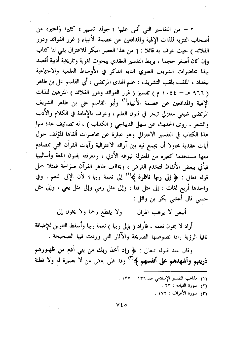 2 - من التفاسير التي أثنى عليها «جولد تسيهر» كثيرا واعتبره من أصحاب التنزيه للذات الإلهية والمدافعين عن عصمة الأنبياء (غرر الفوائد ودرر القلائد) حيث عرف به قائلا: [من هذا العصر المبكر للاعتزال بقي لنا كتاب وإن كان أصغر حجما، يربط التفسير العقدي ببحوث لغوية وتاريخية أدبية أقصد بهذا محاضرات الشريف العلوي النابه الذكر في الأوساط العلمية والاجتماعية ببغداد، الملقب بلقب التشريف: علم الهدى المرتضى، أبي القاسم علي بن طاهر (966 ه - 1044 م) تفسير (غرر الفوائد ودرر القلائد) المنزهين للذات الإلهية والمدافعين عن عصمة الأنبياء «1» وأبو القاسم علي بن طاهر الشريف المرتضى شيعي معتزلي تبحر في فنون العلم، وعرف بالإمامة في الكلام والأدب والشعر، روى الحديث عن سهل الديباجي (الكذاب)، له تصانيف عدة منها هذا الكتاب في التفسير الاعتزالي وهو عبارة عن محاضرات ألقاها المؤلف حول آيات عقدية محاولا أن يجمع فيه بين آرائه الاعتزالية وآيات القرآن التي تتصادم معها مستخدما كغيره من المعتزلة نبوغه الأدبي، ومعرفته بفنون اللغة وأساليبها فيأتي ببعض الألفاظ لتخدم الغرض، ويخالف ظاهر القرآن صراحة فمثلا حمل قوله تعالى: إِلى رَبِّها ناظِرَةٌ «2» إلى نعمة ربها؛ لأن الإلى النعم. وفي واحدها أربع لغات: إلى مثل قفا، وإلى مثل رمي وإلى مثل يعي، وإلى مثل حسي قال أعشى بكر بن وائل: