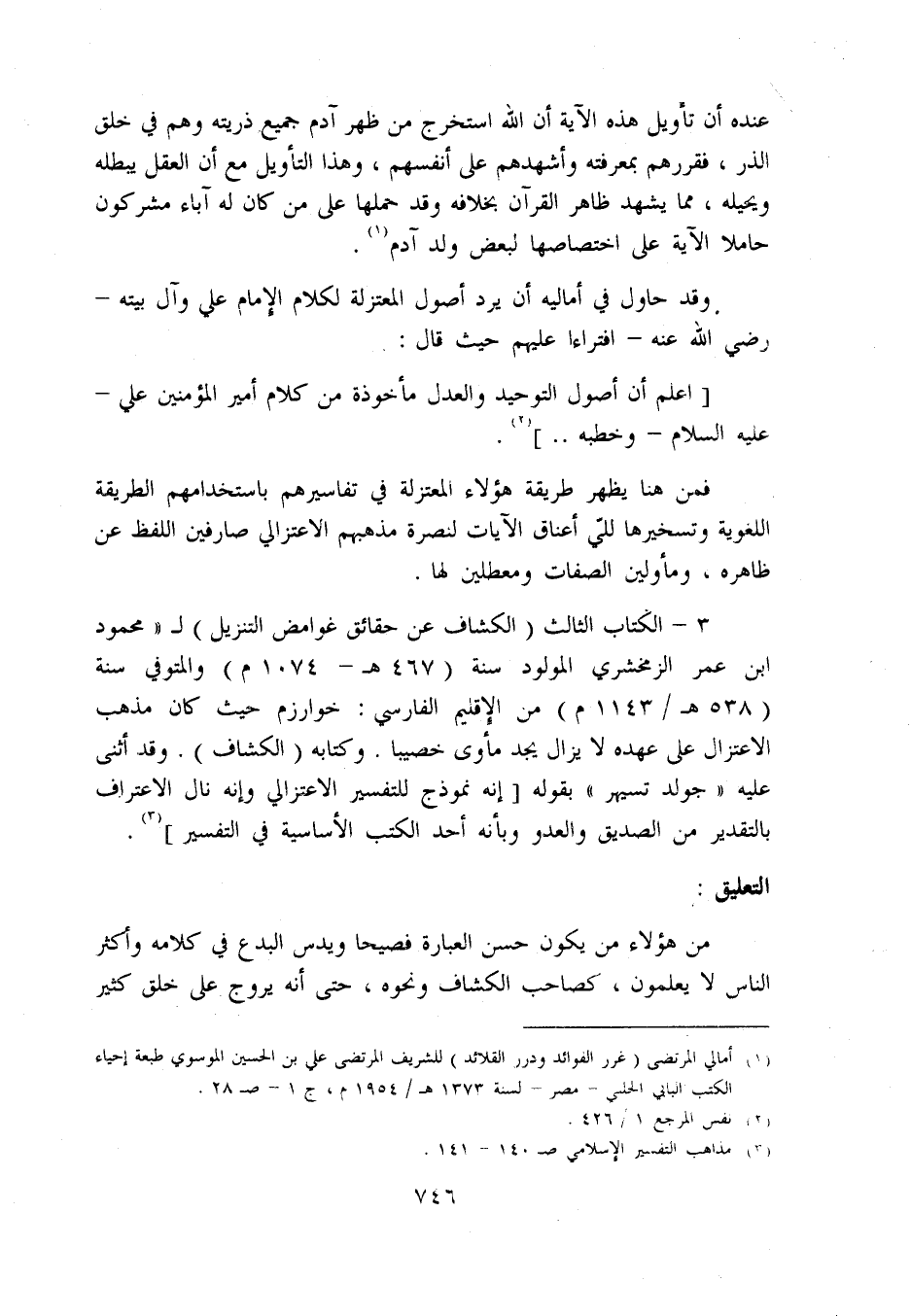 3 - الكتاب الثالث (الكشاف عن حقائق غوامض التنزيل) ل «محمود ابن عمر الزمخشري المولود سنة (467 ه - 1074 م) والمتوفي سنة (538 ه/ 1143 م) من الإقليم الفارسي: خوارزم حيث كان مذهب الاعتزال على عهده لا يزال يجد مأوى خصيبا. وكتابه (الكشاف). وقد أثنى عليه «جولد تسيهر» بقوله [إنه نموذج للتفسير الاعتزالي وإنه نال الاعتراف بالتقدير من الصديق والعدو وبأنه أحد الكتب الأساسية في التفسير] «3».