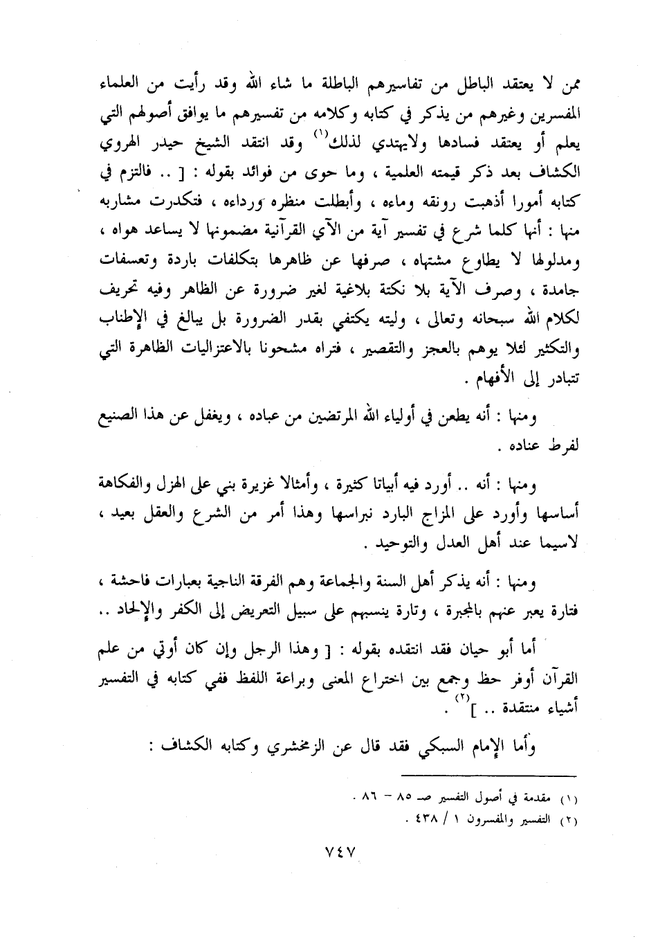 ممن لا يعتقد الباطل من تفاسيرهم الباطلة ما شاء اللّه وقد رأيت من العلماء المفسرين وغيرهم من يذكر في كتابه وكلامه من تفسيرهم ما يوافق أصولهم التي يعلم أو يعتقد فسادها ولا يهتدي لذلك «1» وقد انتقد الشيخ حيدر الهروي الكشاف بعد ذكر قيمته العلمية، وما حوى من فوائد بقوله: [ .. فالتزم في كتابه أمورا أذهبت رونقه وماءه، وأبطلت منظره ورداءه، فتكدرت مشاربه منها: أنها كلما شرع في تفسير آية من الآي القرآنية مضمونها لا يساعد هواه، ومدلولها لا يطاوع مشتهاه، صرفها عن ظاهرها بتكلفات باردة وتعسفات جامدة، وصرف الآية بلا نكتة بلاغية لغير ضرورة عن الظاهر وفيه تحريف لكلام اللّه سبحانه وتعالى، وليته يكتفي بقدر الضرورة بل يبالغ في الإطناب والتكثير لئلا يوهم بالعجز والتقصير، فتراه مشحونا بالاعتزاليات الظاهرة التي تتبادر إلى الأفهام.