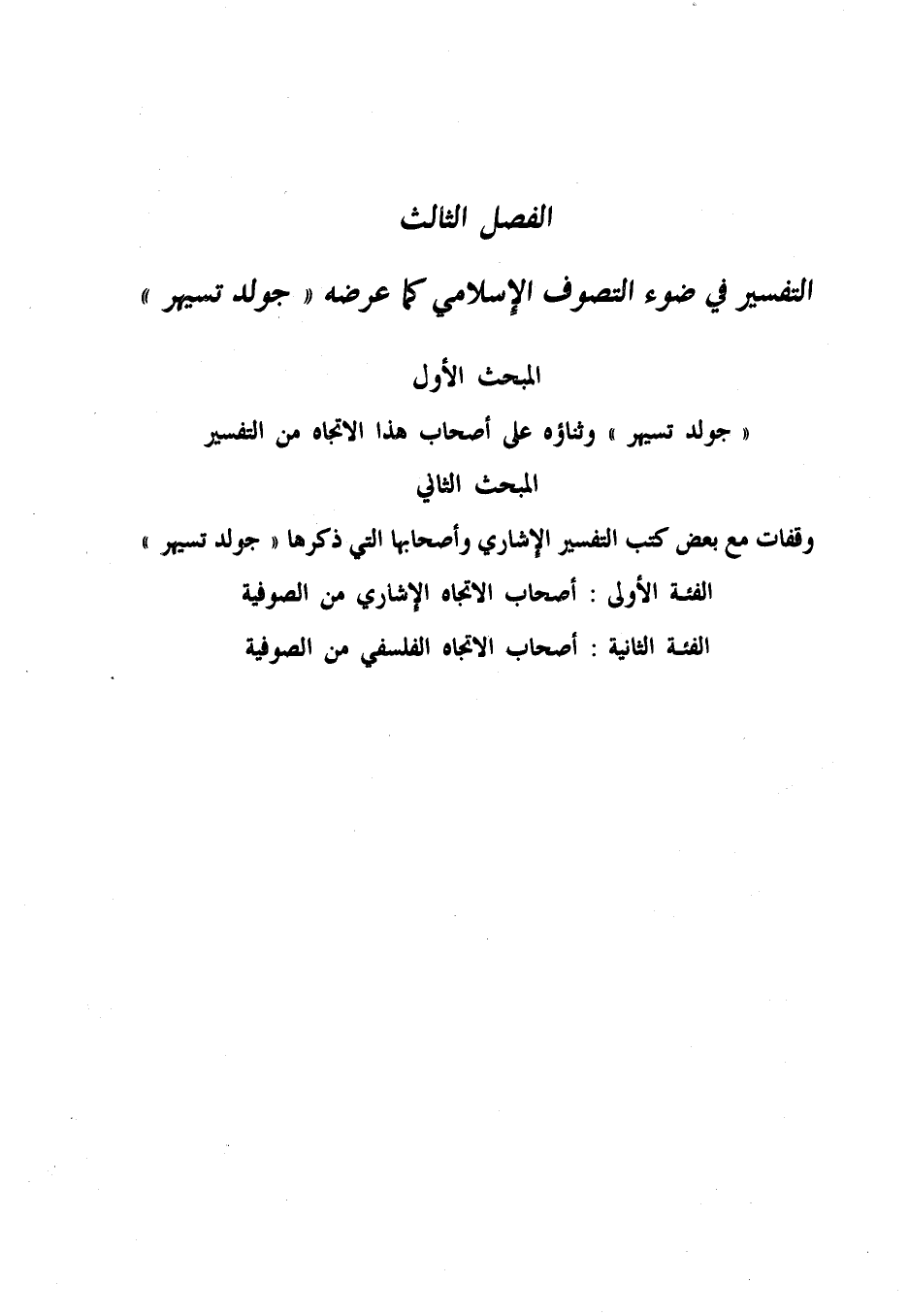الفصل الثالث التفسير في ضوء التصوف الإسلامي كما عرضه «جولد تسيهر» المبحث الأول «جولد تسيهر» وثناؤه على أصحاب هذا الاتجاه من التفسير المبحث الثاني وقفات مع بعض كتب التفسير الإشاري وأصحابها التي ذكرها «جولد تسيهر» الفئة الأولى: أصحاب الاتجاه الإشاري من الصوفية الفئة الثانية: أصحاب الاتجاه الفلسفي من الصوفية