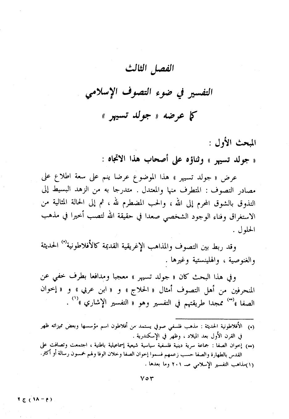 وفي هذا البحث كان «جولد تسيهر» معجبا ومدافعا بطرف خفي عن المنحرفين من أهل التصوف أمثال «الحلاج» و «ابن عربي» و «إخوان الصفا» «2» ممجدا طريقتهم في التفسير وهو «التفسير الإشاري» «3».