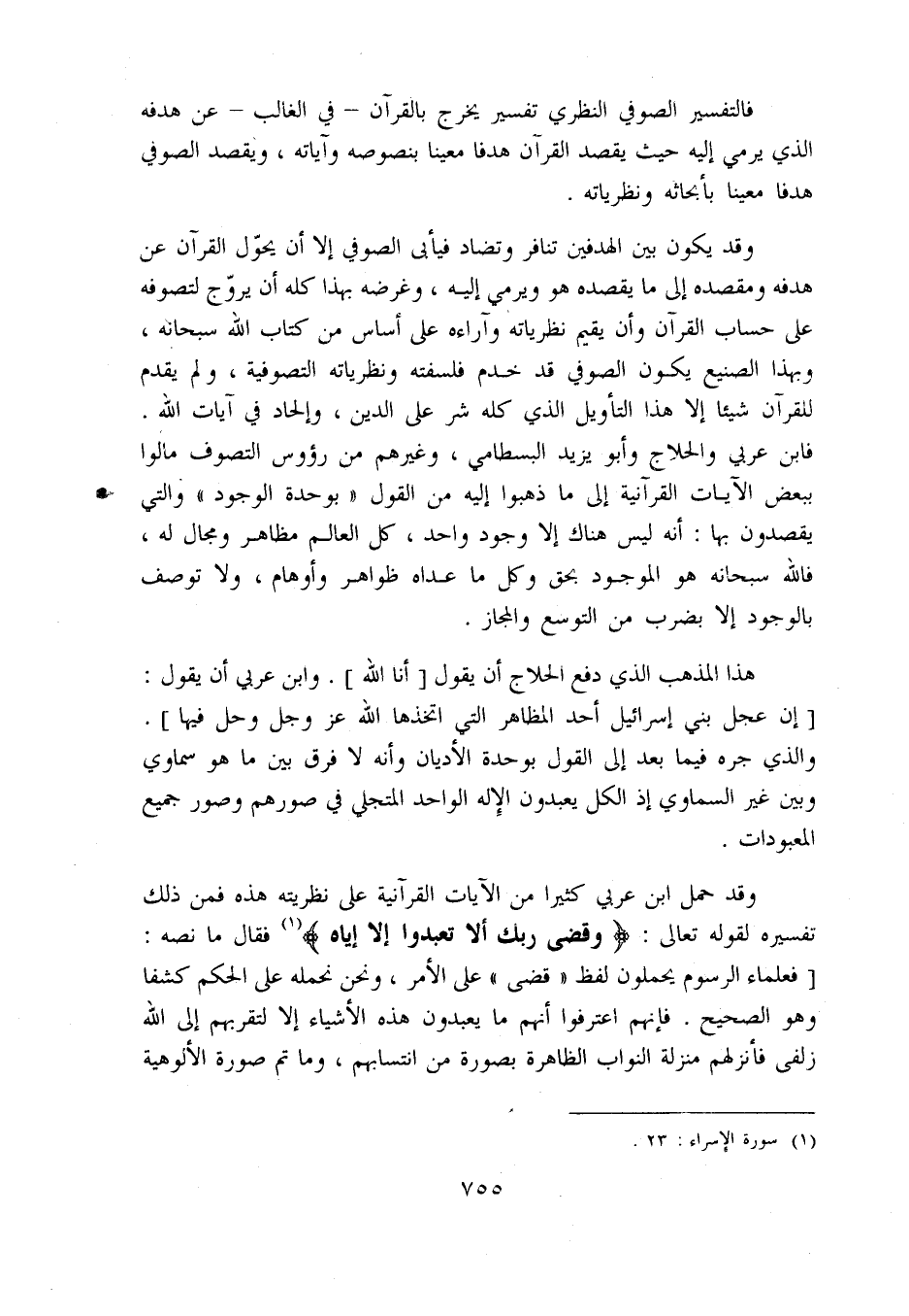 وقد يكون بين الهدفين تنافر وتضاد فيأبى الصوفي إلا أن يحوّل القرآن عن هدفه ومقصده إلى ما يقصده هو ويرمي إليه، وغرضه بهذا كله أن يروّج لتصوفه على حساب القرآن وأن يقيم نظرياته وآراءه على أساس من كتاب اللّه سبحانه، وبهذا الصنيع يكون الصوفي قد خدم فلسفته ونظرياته التصوفية، ولم يقدم للقرآن شيئا إلا هذا التأويل الذي كله شر على الدين، وإلحاد في آيات اللّه.