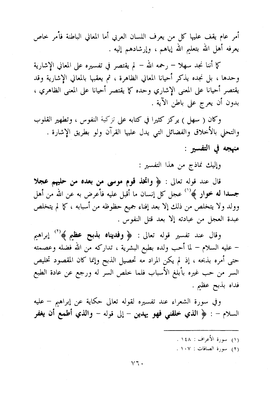 كما أننا نجد سهلا - رحمه اللّه - لم يقتصر في تفسيره على المعاني الإشارية وحدها، بل نجده يذكر أحيانا المعاني الظاهرة، ثم يعقبها بالمعاني الإشارية وقد يقتصر أحيانا على المعنى الإشاري وحده كما يقتصر أحيانا على المعنى الظاهري، بدون أن يعرج على باطن الآية.