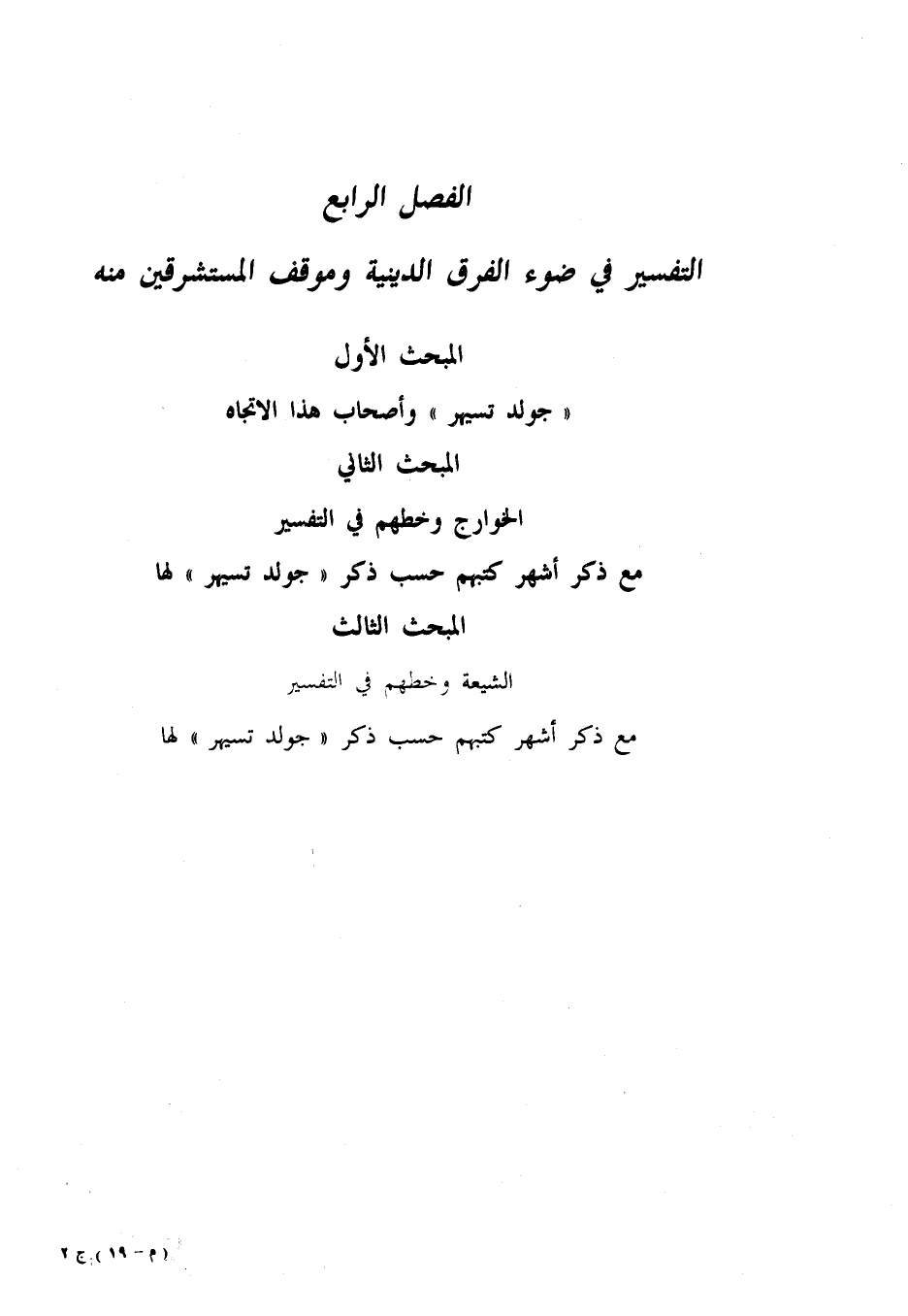 الفصل الرابع التفسير في ضوء الفرق الدينية وموقف المستشرقين منه المبحث الأول «جولد تسيهر» وأصحاب هذا الاتجاه المبحث الثاني الخوارج وخطهم في التفسير مع ذكر أشهر كتبهم حسب ذكر «جولد تسيهر» لها المبحث الثالث الشيعة وخطهم في التفسير مع ذكر أشهر كتبهم حسب ذكر «جولد تسيهر» لها