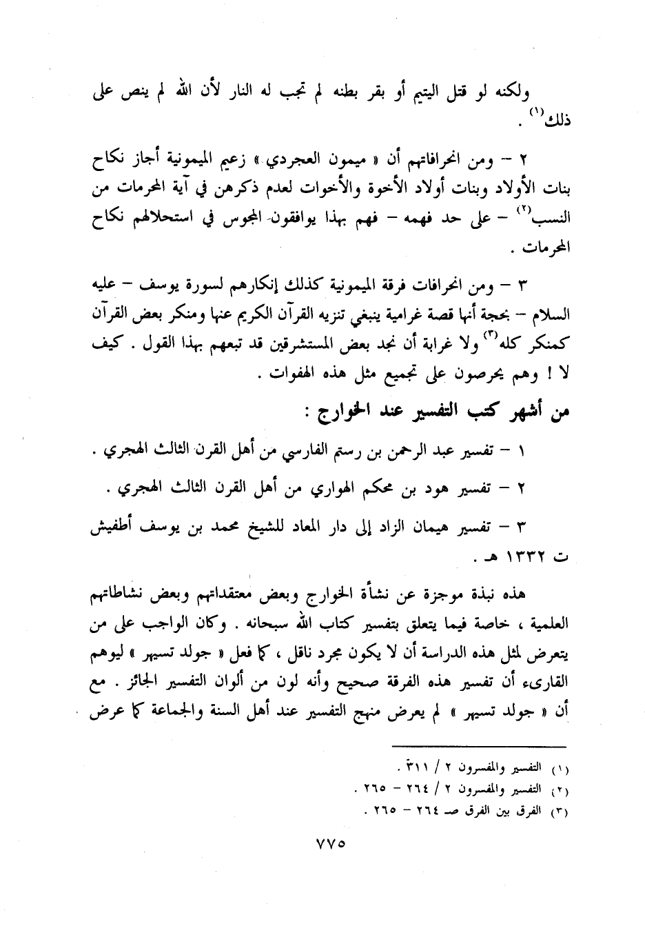 هذه نبذة موجزة عن نشأة الخوارج وبعض معتقداتهم وبعض نشاطاتهم العلمية، خاصة فيما يتعلق بتفسير كتاب اللّه سبحانه. وكان الواجب على من يتعرض لمثل هذه الدراسة أن لا يكون مجرد ناقل، كما فعل «جولد تسيهر» ليوهم القارئ أن تفسير هذه الفرقة صحيح وأنه لون من ألوان التفسير الجائز. مع أن «جولد تسيهر» لم يعرض منهج التفسير عند أهل السنة والجماعة كما عرض