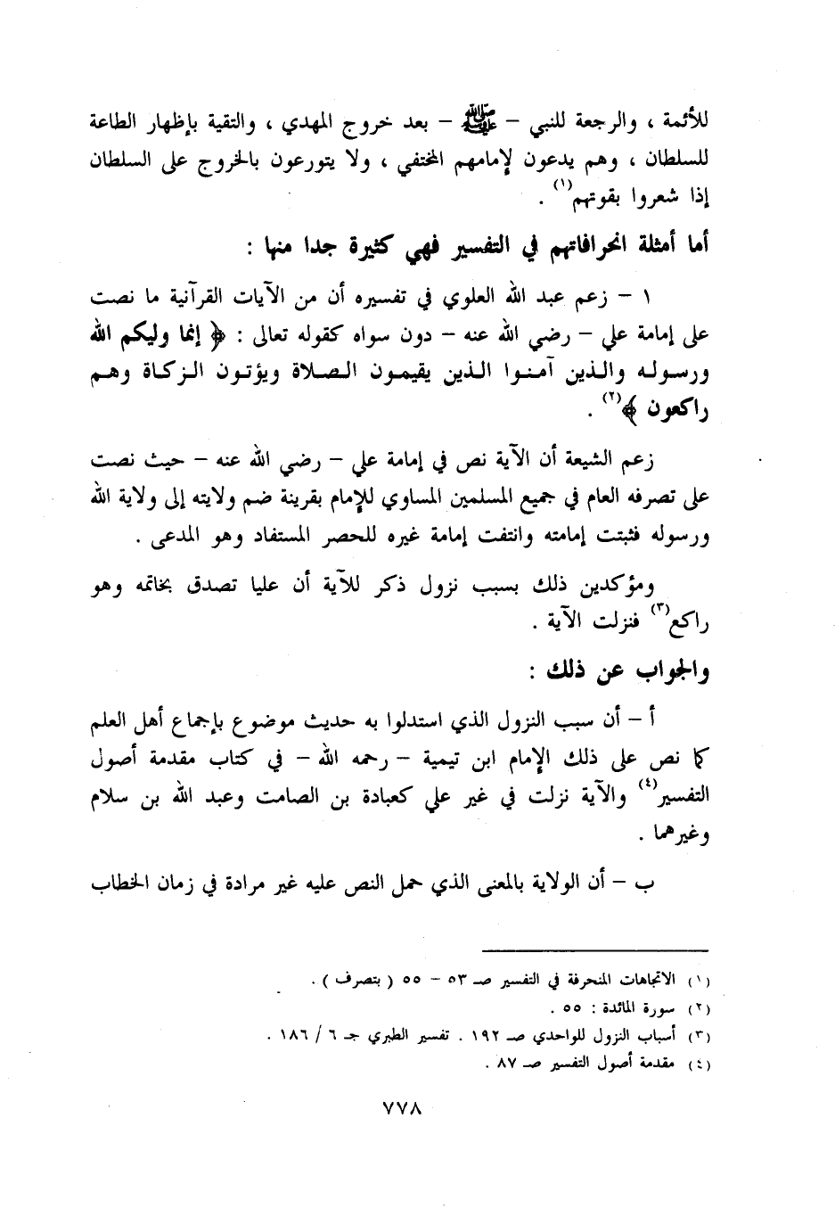 1 - زعم عبد اللّه العلوي في تفسيره أن من الآيات القرآنية ما نصت على إمامة علي - رضي اللّه عنه - دون سواه كقوله تعالى: إِنَّما وَلِيُّكُمُ اللَّهُ ورَسُولُهُ والَّذِينَ آمَنُوا الَّذِينَ يُقِيمُونَ الصَّلاةَ ويُؤْتُونَ الزَّكاةَ وهُمْ راكِعُونَ «2».