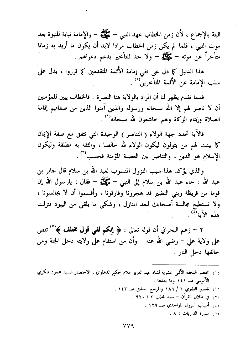 (1) مختصر التحفة الاثنى عشرية لشاه عبد العزيز علام حكيم الدهلوي، الاختصار السيد محمود شكري الآلوسي ص 141 وما بعدها.