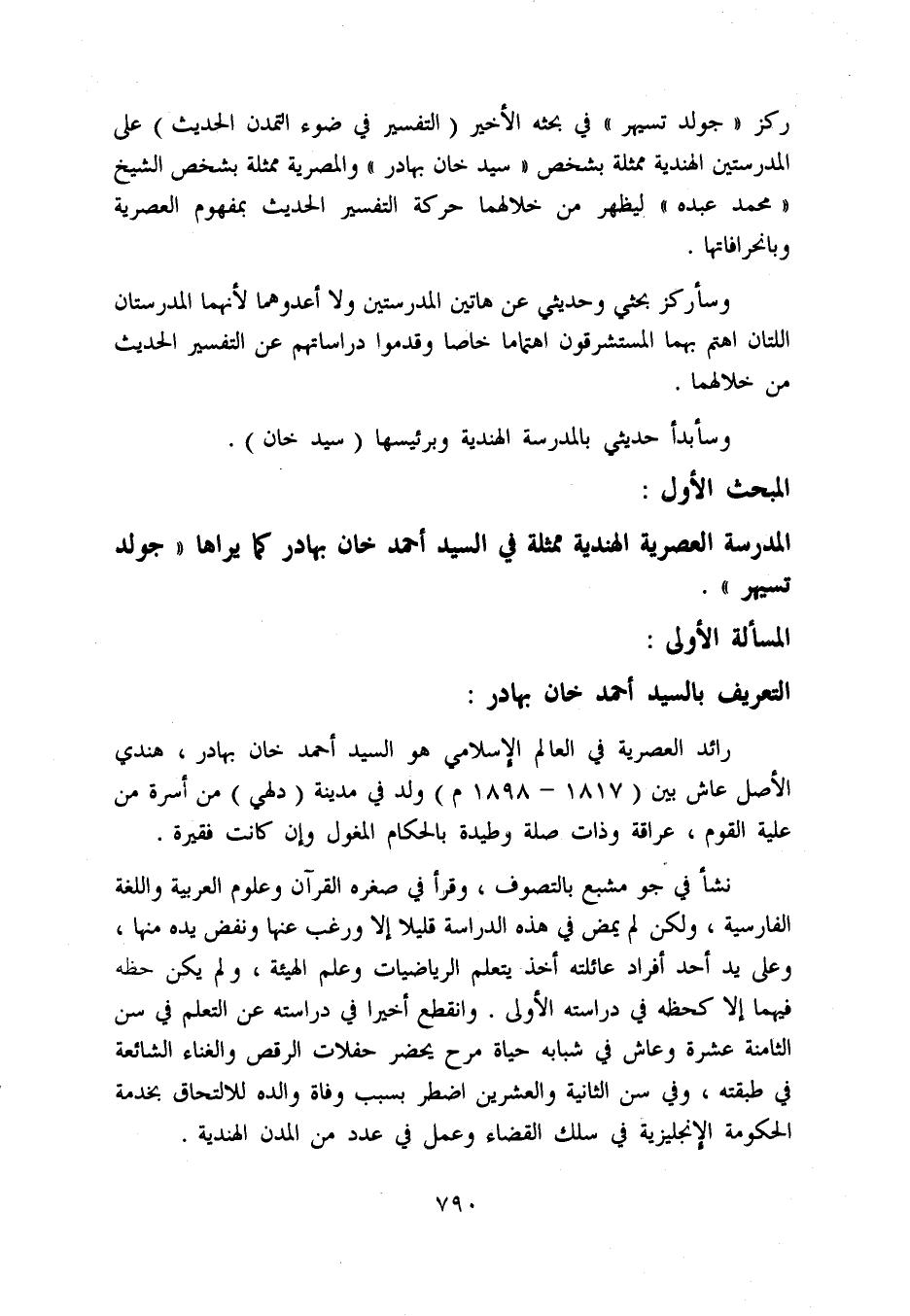 المبحث الأول: المدرسة العصرية الهندية ممثلة في السيد أحمد خان بهادر كما يراها «جولد تسيهر».