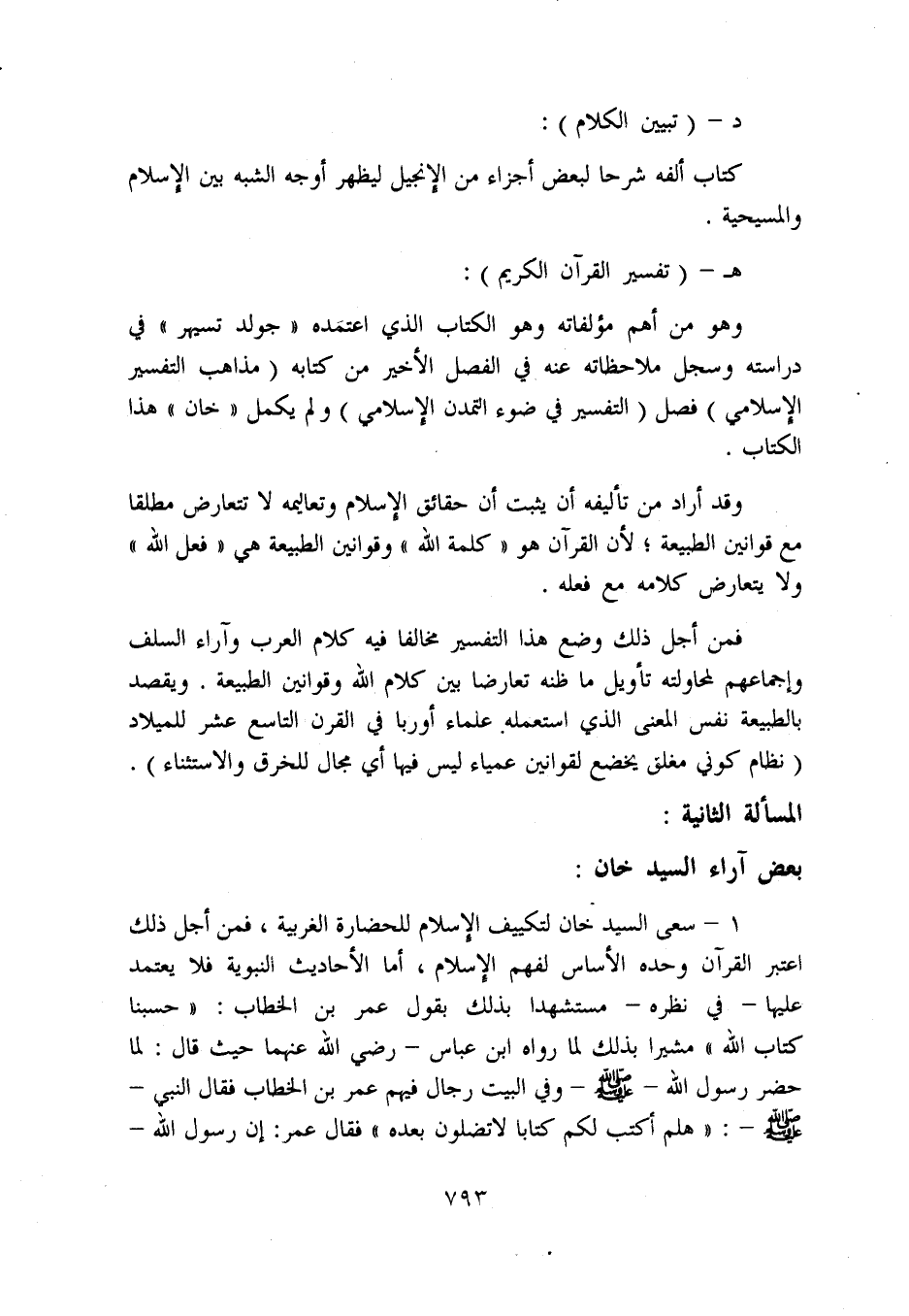 1 - سعى السيد خان لتكييف الإسلام للحضارة الغربية، فمن أجل ذلك اعتبر القرآن وحده الأساس لفهم الإسلام، أما الأحاديث النبوية فلا يعتمد عليها - في نظره - مستشهدا بذلك بقول عمر بن الخطاب: «حسبنا كتاب اللّه» مشيرا بذلك لما رواه ابن عباس - رضي اللّه عنهما حيث قال: لما حضر رسول اللّه - صلّى اللّه عليه وسلم - وفي البيت رجال فيهم عمر بن الخطاب فقال النبي - صلّى اللّه عليه وسلم -: «هلم أكتب لكم كتابا لا تضلون بعده» فقال عمر: إن رسول اللّه -