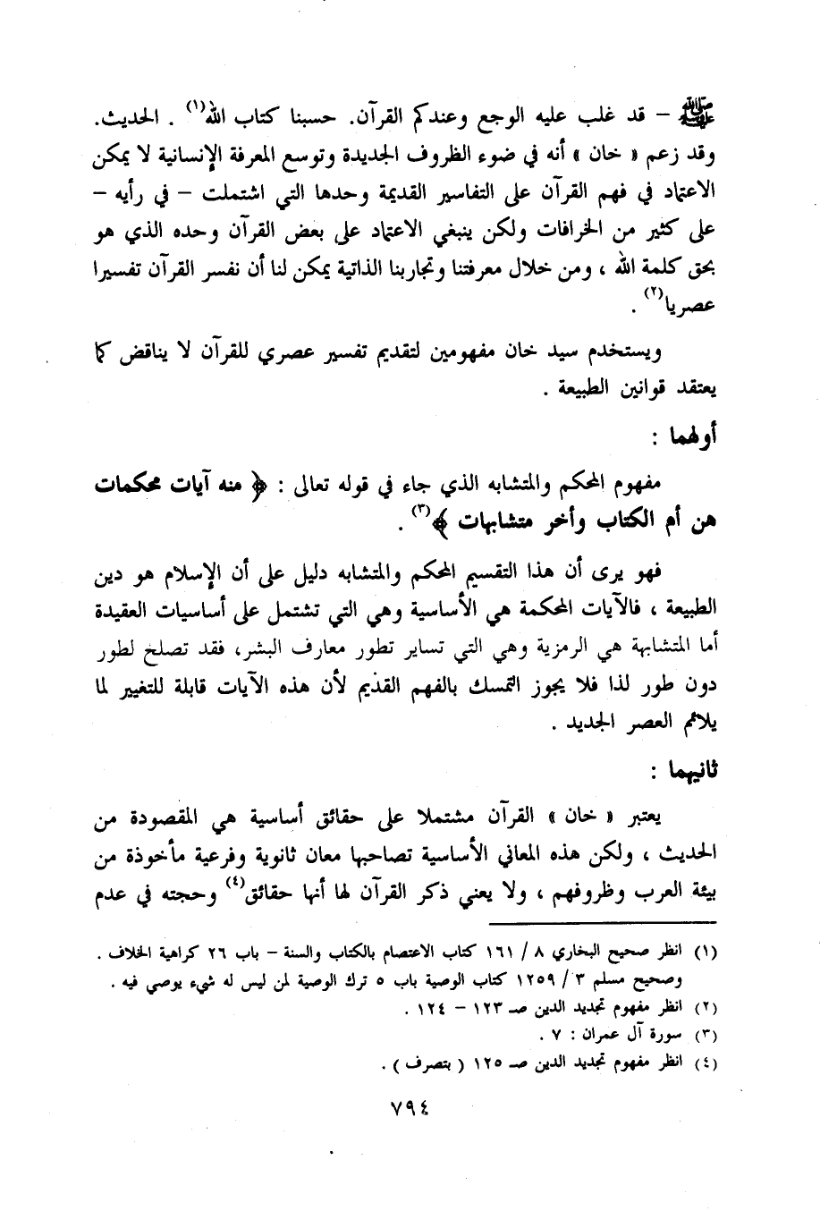 يعتبر «خان» القرآن مشتملا على حقائق أساسية هي المقصودة من الحديث، ولكن هذه المعاني الأساسية تصاحبها معان ثانوية وفرعية مأخوذة من بيئة العرب وظروفهم، ولا يعني ذكر القرآن لها أنها حقائق «4» وحجته في عدم