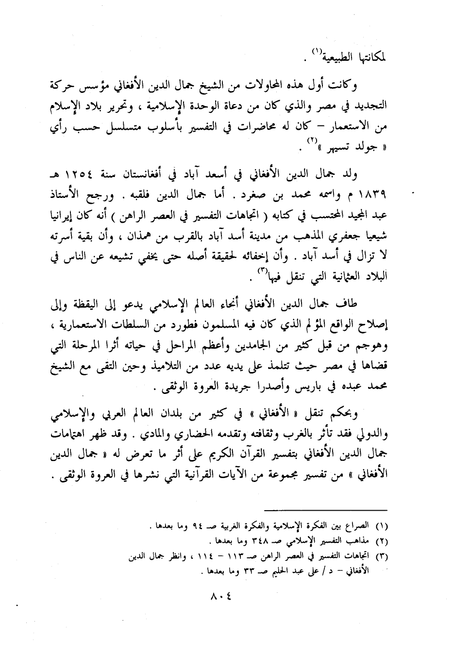 (3) اتجاهات التفسير في العصر الراهن ص 113 - 114، وانظر جمال الدين الأفغاني - د/ على عبد الحليم ص 33 وما بعدها.
