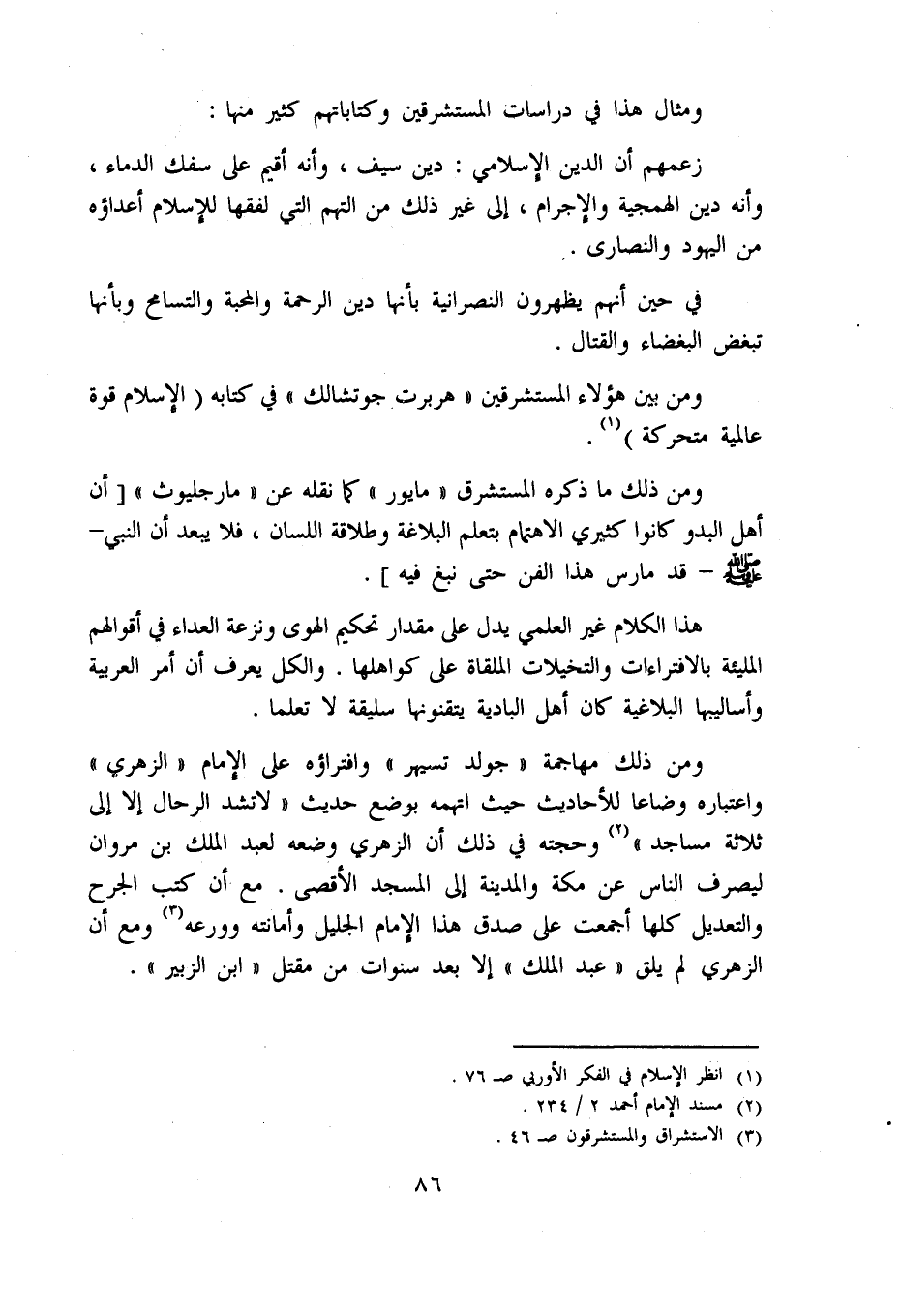 ومن ذلك مهاجمة «جولد تسيهر» وافتراؤه على الإمام «الزهري» واعتباره وضاعا للأحاديث حيث اتهمه بوضع حديث «لا تشد الرحال إلا إلى ثلاثة مساجد» «2» وحجته في ذلك أن الزهري وضعه لعبد الملك بن مروان ليصرف الناس عن مكة والمدينة إلى المسجد الأقصى. مع أن كتب الجرح والتعديل كلها أجمعت على صدق هذا الإمام الجليل وأمانته وورعه «3» ومع أن الزهري لم يلق «عبد الملك» إلا بعد سنوات من مقتل «ابن الزبير».
