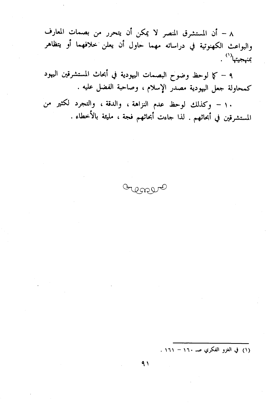 8 - أن المستشرق المنصر لا يمكن أن يتحرر من بصمات المعارف والبواعث الكهنوتية في دراساته مهما حاول أن يعلن خلافهما أو يتظاهر بمنهجيتها «1».