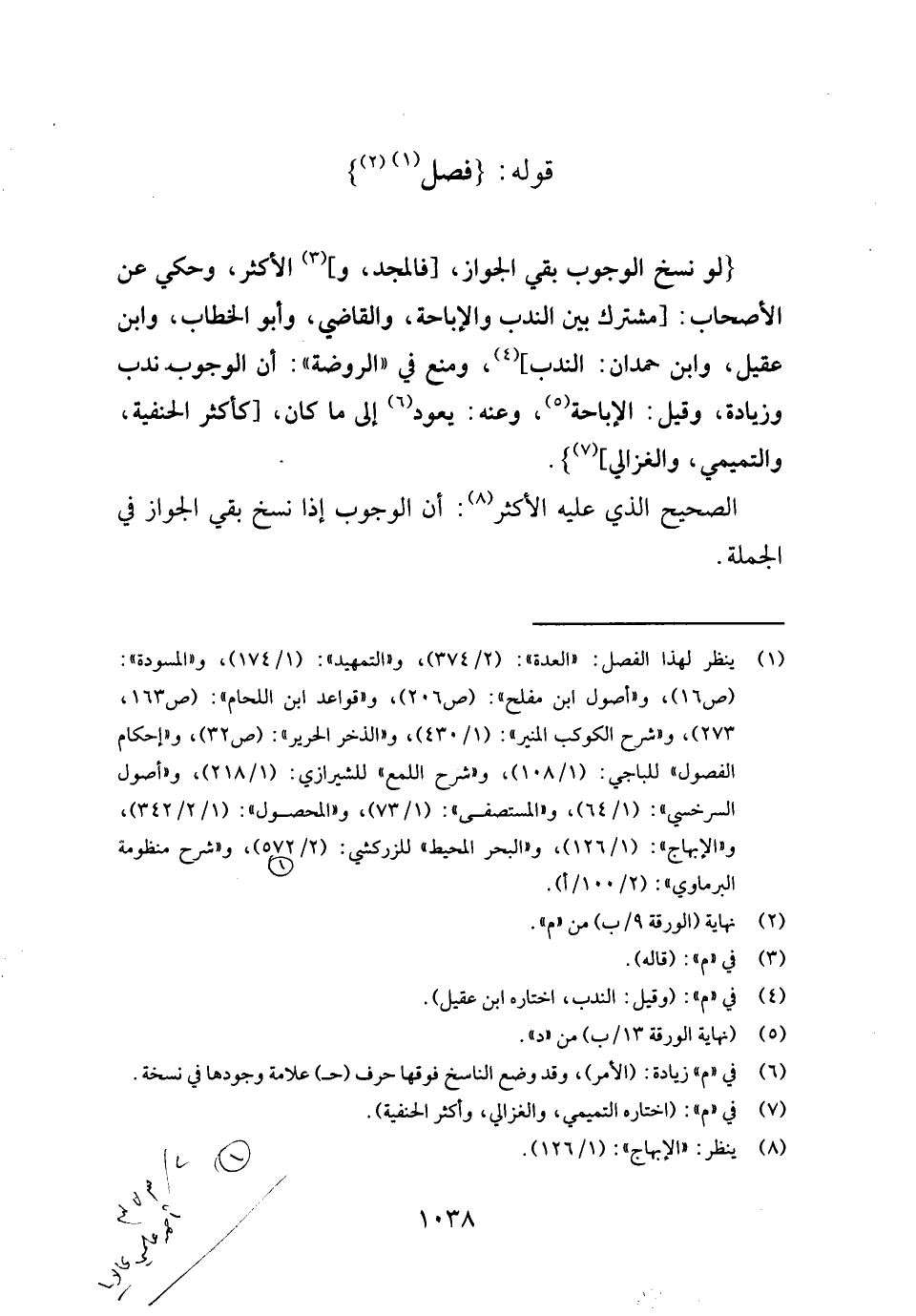 الصَّحِيح الَّذِي عَلَيْهِ الْأَكْثَر: أَن الْوُجُوب إِذا نسخ بَقِي الْجَوَاز فِي الْجُمْلَة.