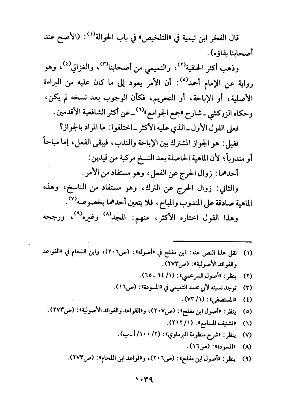 قَالَ الْفَخر ابْن تَيْمِية فِي " التَّلْخِيص " فِي بَاب الْحِوَالَة: (الْأَصَح عِنْد أَصْحَابنَا بَقَاؤُهُ) .