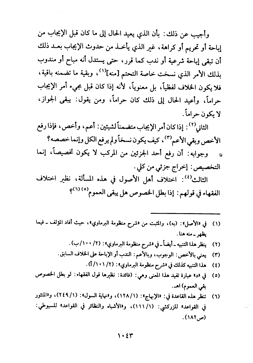 وَأجِيب عَن ذَلِك: بِأَن الَّذِي يُعِيد الْحَال إِلَى مَا كَانَ قبل الْإِيجَاب من إِبَاحَة أَو تَحْرِيم أَو كَرَاهَة، غير الَّذِي يَأْخُذ من حُدُوث الْإِيجَاب بعد ذَلِك أَن تبقى إِبَاحَة شَرْعِيَّة أَو ندب كَمَا قرر، حَتَّى يسْتَدلّ أَنه مُبَاح أَو مَنْدُوب بذلك الْأَمر الَّذِي نسخت خَاصَّة التحتم [مِنْهُ] ، وَبَقِيَّة مَا تضمنه بَاقِيَة، فَلَا يكون الْخلاف لفظيا، بل معنويا، لِأَنَّهُ إِذا كَانَ قبل مَجِيء أَمر الْإِيجَاب حَرَامًا، وأعيد الْحَال إِلَى ذَلِك كَانَ حَرَامًا، وَمن يَقُول: يبْقى الْجَوَاز، لَا يكون حَرَامًا.