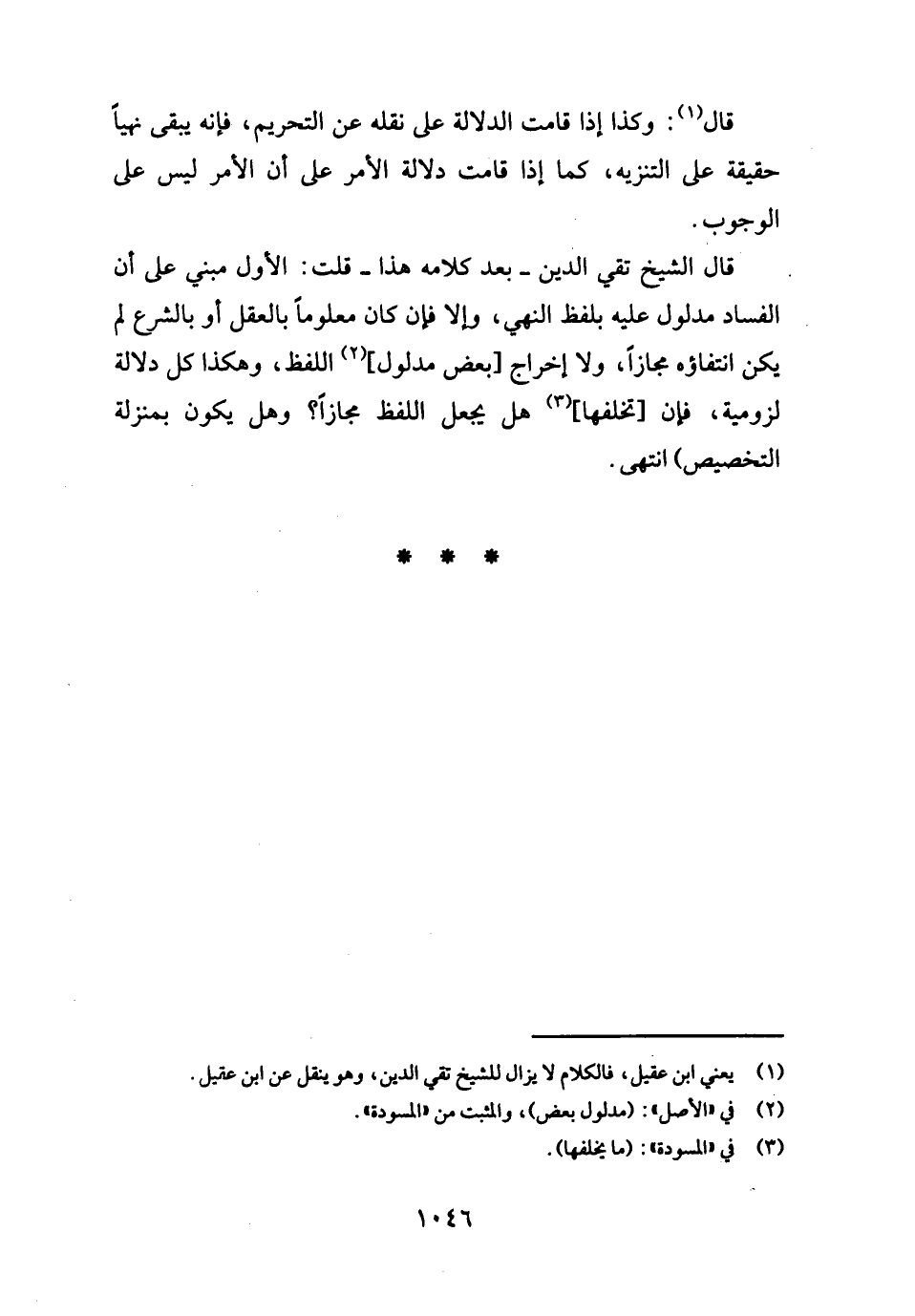 قَالَ الشَّيْخ تَقِيّ الدّين - بعد كَلَامه هَذَا - قلت: الأول مَبْنِيّ على أَن الْفساد مَدْلُول عَلَيْهِ بِلَفْظ النَّهْي، وَإِلَّا فَإِن كَانَ مَعْلُوما بِالْعقلِ أَو بِالشَّرْعِ لم يكن انتفاؤه مجَازًا، وَلَا إِخْرَاج [بعض مَدْلُول] اللَّفْظ، وَهَكَذَا كل دلَالَة لزومية، فَإِن [تخلفها] هَل يَجْعَل اللَّفْظ مجَازًا؟ وَهل يكون بِمَنْزِلَة التَّخْصِيص) انْتهى.