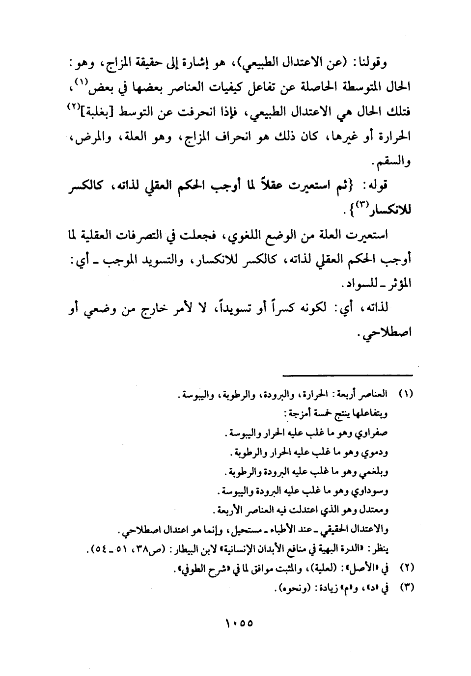 وَقَوْلنَا: (عَن الِاعْتِدَال الطبيعي) ، هُوَ إِشَارَة إِلَى حَقِيقَة المزاج، وَهُوَ: الْحَال المتوسطة الْحَاصِلَة عَن تفَاعل كيفيات العناصر بَعْضهَا فِي بعض، فَتلك الْحَال هِيَ الِاعْتِدَال الطبيعي، فَإِذا انحرفت عَن التَّوَسُّط [بِغَلَبَة] الْحَرَارَة أَو غَيرهَا، كَانَ ذَلِك هُوَ انحراف المزاج، وَهُوَ الْعلَّة، وَالْمَرَض، والسقم.