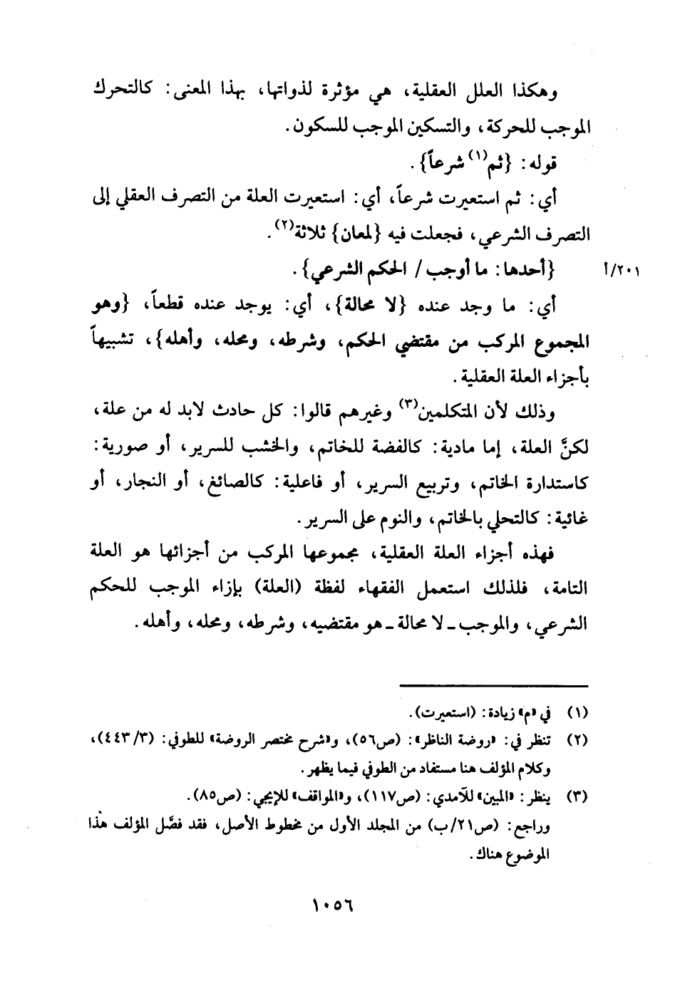 فَهَذِهِ أَجزَاء الْعلَّة الْعَقْلِيَّة، مجموعها الْمركب من أَجْزَائِهَا هُوَ الْعلَّة التَّامَّة، فَلذَلِك اسْتعْمل الْفُقَهَاء لَفْظَة (الْعلَّة) بِإِزَاءِ الْمُوجب للْحكم الشَّرْعِيّ، والموجب - لَا محَالة - ومقتضية، وَشَرطه، وَمحله، وَأَهله.