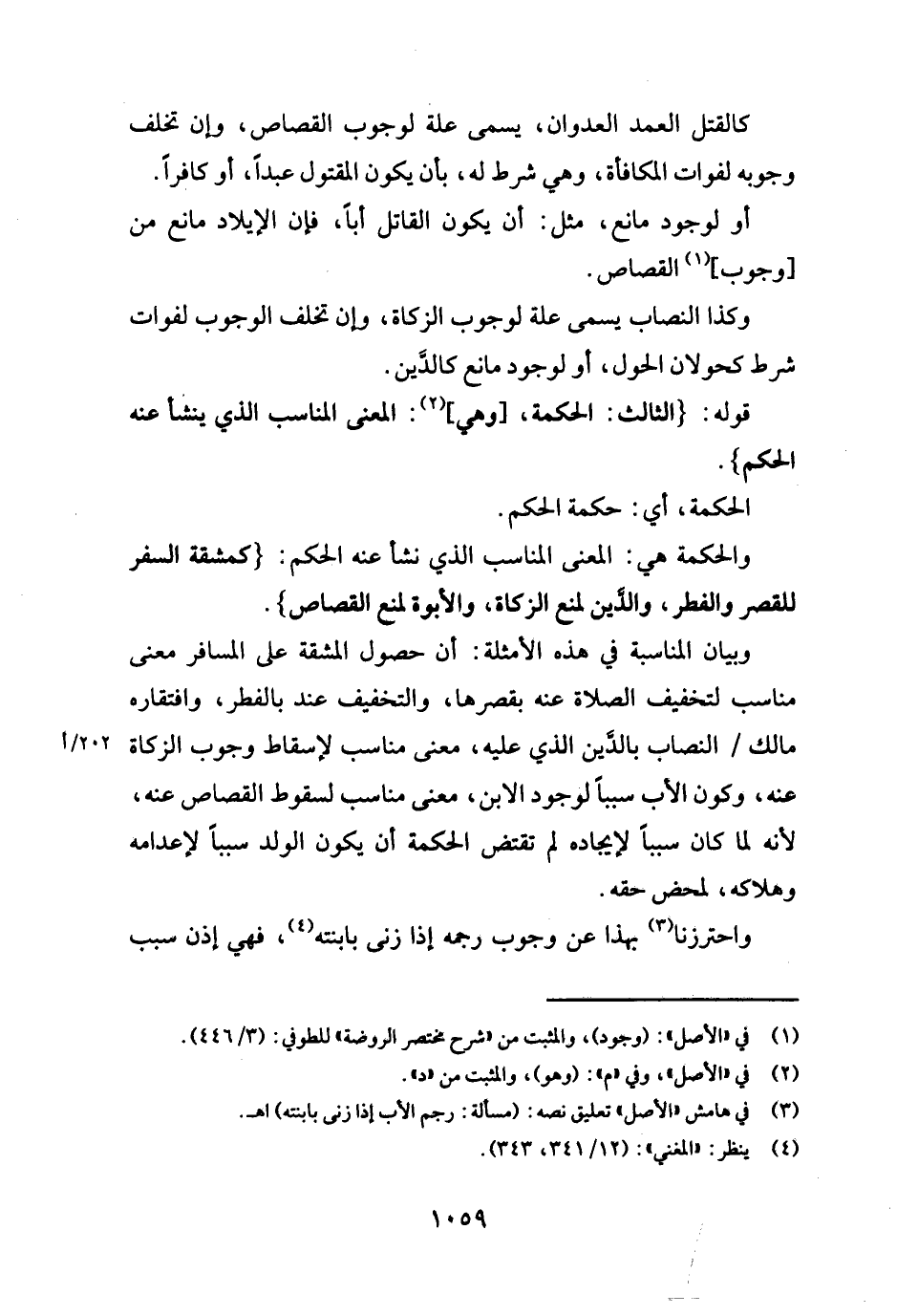 وَبَيَان الْمُنَاسبَة فِي هَذِه الْأَمْثِلَة: أَن حُصُول الْمَشَقَّة على الْمُسَافِر معنى مُنَاسِب لتخفيف الصَّلَاة عَنهُ بقصرها، وَالتَّخْفِيف عِنْد بِالْفطرِ، وافتقاره مَالك النّصاب بِالدّينِ الَّذِي عَلَيْهِ، معنى مُنَاسِب لإِسْقَاط وجوب الزَّكَاة عَنهُ، وَكَون الْأَب سَببا لوُجُود الابْن، معنى مُنَاسِب لسُقُوط الْقصاص عَنهُ، لِأَنَّهُ لما كَانَ سَببا لإيجاده لم تقتض الْحِكْمَة أَن يكون الْوَلَد سَببا لإعدامه وهلاكه، لمحض حَقه.