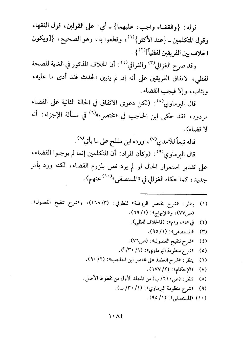قَالَ الْبرمَاوِيّ: (وَكَأن المُرَاد: أَن الْمُتَكَلِّمين إِنَّمَا لم يوجبوا الْقَضَاء، على تَقْدِير اسْتِمْرَار الْحَال لَو لم يرد نَص بِلُزُوم الْقَضَاء، لكنه ورد بِأَمْر جَدِيد، كَمَا حَكَاهُ الْغَزالِيّ فِي " الْمُسْتَصْفى " عَنْهُم) .
