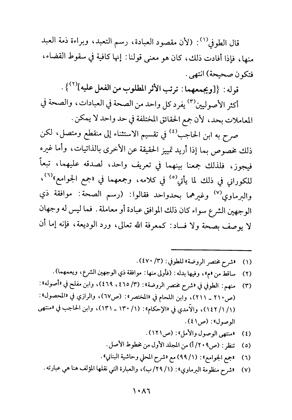 صرح بِهِ ابْن الْحَاجِب فِي تَقْسِيم الِاسْتِثْنَاء إِلَى مُنْقَطع ومتصل، لَكِن ذَلِك مَخْصُوص بِمَا إِذا أُرِيد تَمْيِيز الْحَقِيقَة عَن الْأُخْرَى بالذاتيات، وَأما غَيره فَيجوز، فَلذَلِك جَمعنَا بَينهمَا فِي تَعْرِيف وَاحِد، لصدقه عَلَيْهِمَا، تبعا للكوراني فِي ذَلِك لما يَأْتِي فِي كَلَامه، وجمعهما فِي " جمع الْجَوَامِع "، والبرماوي وَغَيرهمَا بِحَدّ وَاحِد فَقَالُوا: (رسم الصِّحَّة: مُوَافقَة ذِي الْوَجْهَيْنِ الشَّرْع سَوَاء كَانَ ذَلِك الْمُوَافق عبَادَة أَو مُعَاملَة. فَمَا لَيْسَ لَهُ وَجْهَان لَا يُوصف بِصِحَّة وَلَا فَسَاد: كمعرفة الله تَعَالَى، ورد الْوَدِيعَة، فَإِنَّهُ إِمَّا أَن