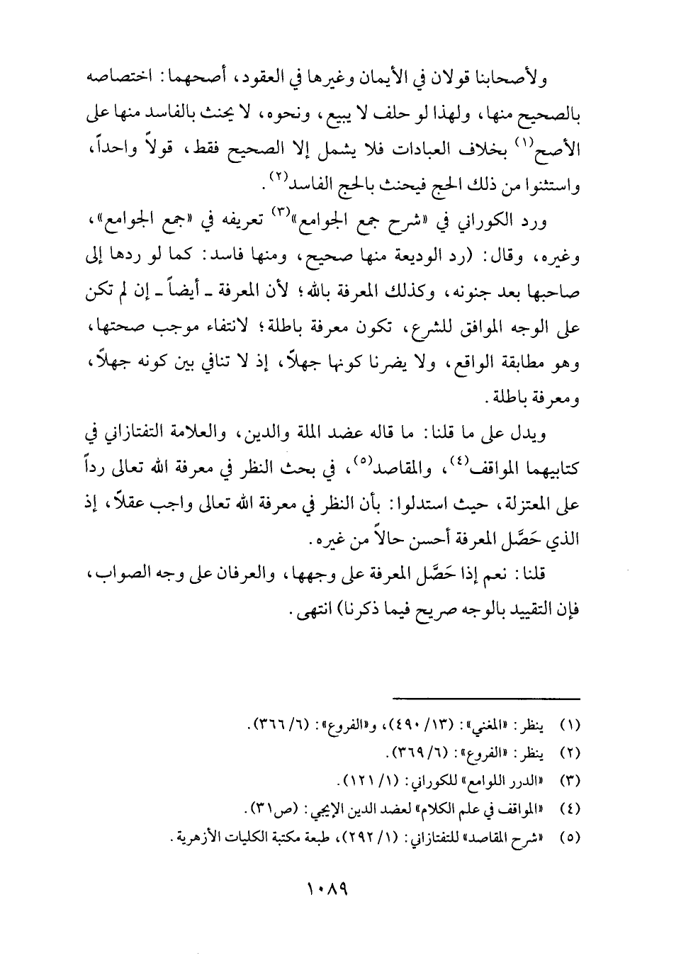 ورد الكوراني فِي " شرح جمع الْجَوَامِع " تَعْرِيفه فِي " جمع الْجَوَامِع "، وَغَيره، وَقَالَ: (رد الْوَدِيعَة مِنْهَا صَحِيح، وَمِنْهَا فَاسد: كَمَا لَو ردهَا إِلَى صَاحبهَا بعد جُنُونه، وَكَذَلِكَ الْمعرفَة بِاللَّه؛ لِأَن الْمعرفَة - أَيْضا - إِن لم تكن على الْوَجْه الْمُوَافق للشَّرْع، تكون معرفَة بَاطِلَة؛ لانْتِفَاء مُوجب صِحَّتهَا، وَهُوَ مُطَابقَة الْوَاقِع، وَلَا يضرنا كَونهَا جهلا، إِذْ لَا تنَافِي بَين كَونه جهلا، وَمَعْرِفَة بَاطِلَة.